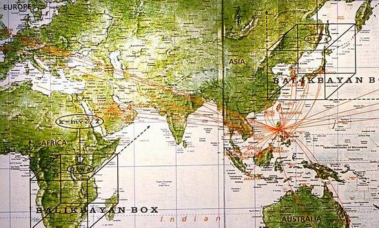 team of doctors and faith healer assemble at a maximum safety laboratory at an undisclosed location. Through extensive study of the live subject, the Balikbayan Box, they analyze the box and the historic implications of this exobiological organism as it grew out of first contact with colonial organisms. The results show that at present transmission is primarily airborne and that is it composed of hydrogen, oxygen, nitrogen and carbon, the basic elements of life on earth. It appears however, to have evolved in a totally unique way. It consumes plastic, leather, spam, electronic products, chocolate and steak. Only gas, light and corrupt customs officials affect it. There are no excretions. It consumes everything and wastes nothing. Emotional, physical and intellectual energy is converted to matter. The growth medium is the box itself. It divides and mutates at the same time. The bio map traces its growth and potential spread. The petri dishes contain complex Balikbayan cultures that are the result of extreme conditions. The magnifications scan the box interior in an attempt to better understand how Balikbayan energy is converted into very particular forms of matter.