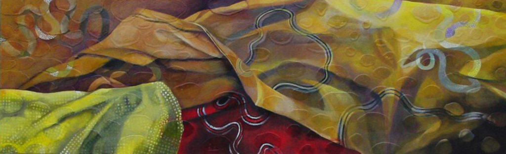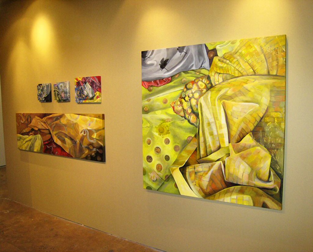 In this series of paintings the interplay of the conscious and subconscious is painted into the folds of sheets and the shapes of pillows. Images, symbols and words surface in lush layers of form, color and texture. In art history, the rendering of drapery has represented different meaning in every era. In this contemporary context, it refers to the obsessions and wanderings of our dreamworlds as they respond to the messages of our “lifeworld.” The folds of fabric are analogous to the bedsheets, landscapes of our imagination and topographies of our brain. Symbols are the language of dreams in which the rules of reality do not apply. Dreams, like art, are open to interpretation. Our rational minds are colonized by the mysteries of our subconscious as it processes the information we receive while awake. This work was inspired by the philosopher Jürgen Habermas and his concept of the “Colonization of the Lifeworld” where culture, meaning and value are colonized by the instrumental rationality of the modern marketplace system. In this sense what is irrational is subject to what might be falsely rational.