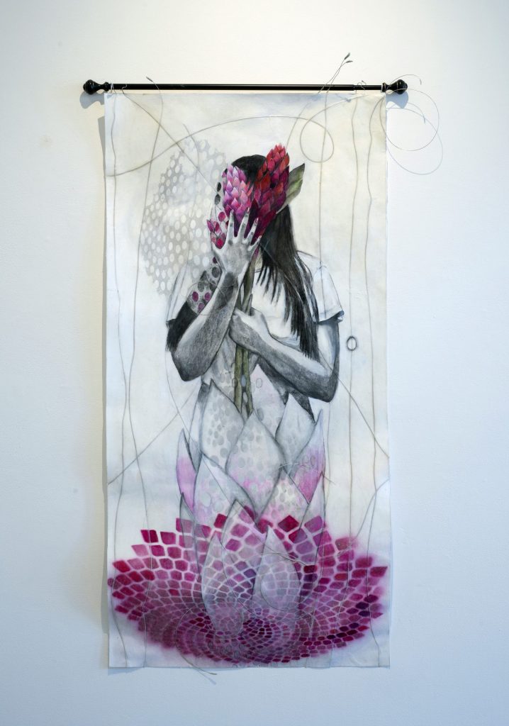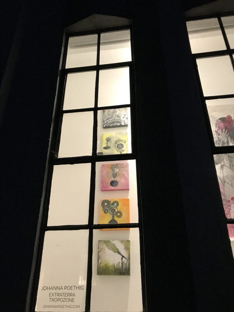 In the Third Street windows, five paintings depict old-fashioned microphones and Nikola Tesla’s Wardenclyffe Tower. The forking rays extending from these objects could be interpreted as sound or energy, but their patterning is also similar to mycorrhizal networks, bringing to mind the deeper connections and unseen forces that support and influence our daily lives. Quinacridone Succulent (2022) depicts a woman emerging from the center of a succulent plant, masking her face with large tropical flowers. Poethig uses nonrepeating patterns as a way of linking the body to the larger systems of life on Earth.