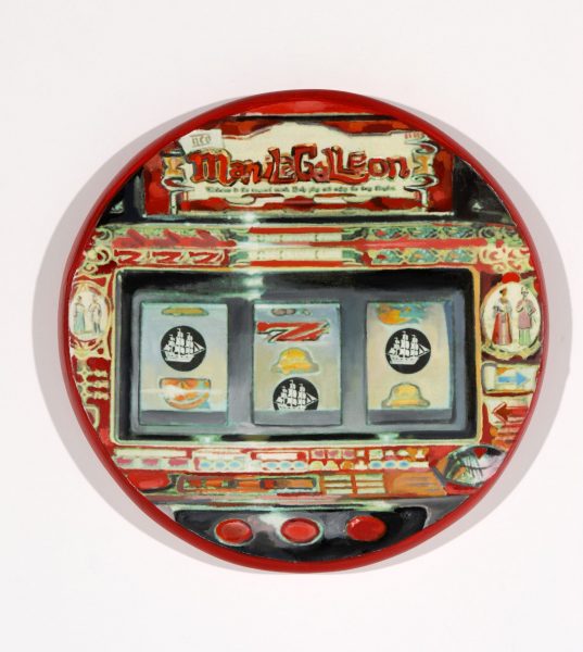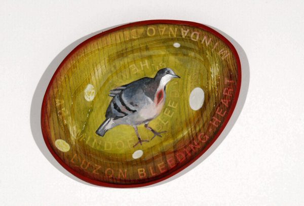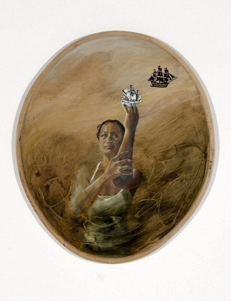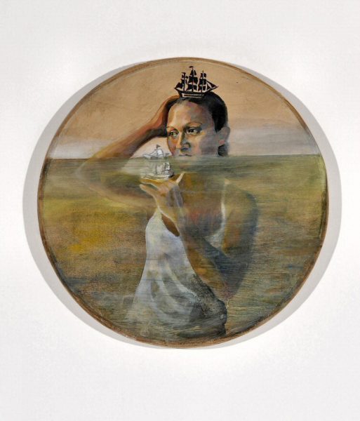 This installation rifts conceptually and visually on the Galleon Trade history and its relationship to today’s Global Trade. The collection of small wood circles and ovals that float like islands within a silk ocean are painted with my own list of contents. There are slot machine images of the galleon gamble, maggots in the food of Global Trade Risk, hemp, blood, pearls and the small indigenous dove, the Luzon Bleeding Heart. The “Waiting for my Ship to come in Pedicure” has the animal symbols of China, California, Spain and Mexico caught in between the toes of human vanity and desire. Hybrid Madonna and China Poblana are trapped in Coca Cola bottles floating on a sea of colonial cultures. Three paintings called OFW (Overseas Filipino Workers) are resigned, hopeful and drowning. “Conquistador” mixes painted newspaper clippings of the WTO demonstration in Hongkong with old drawings of babies being fed to dogs by conquistadors. The paintings Traffick a word originating in the first global trade, resonates today.