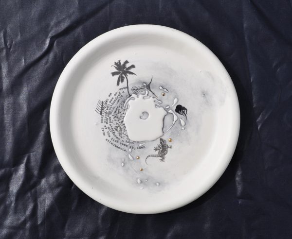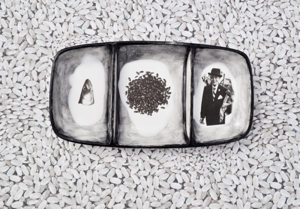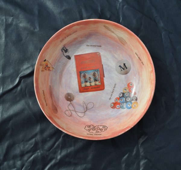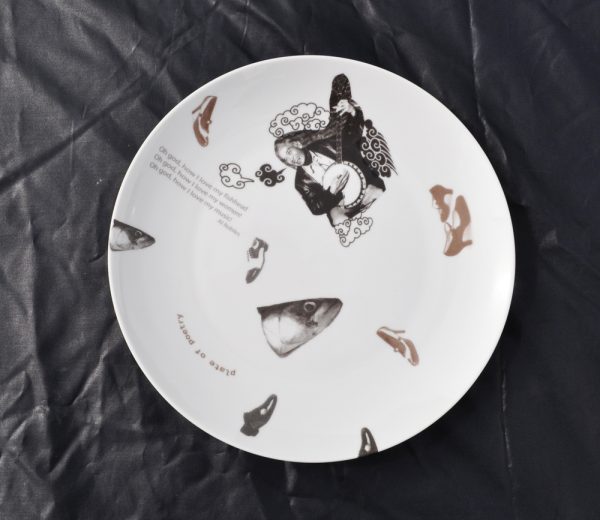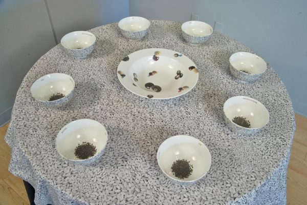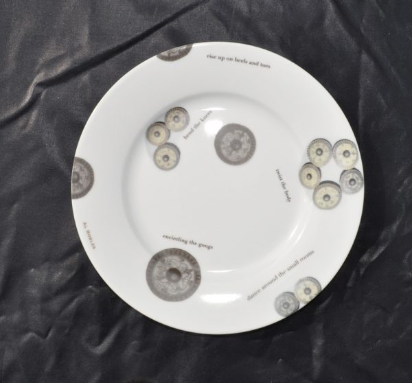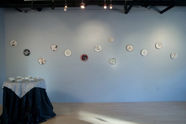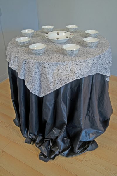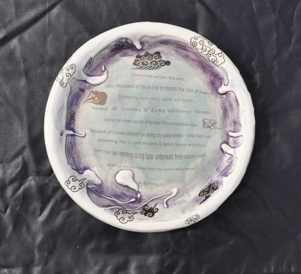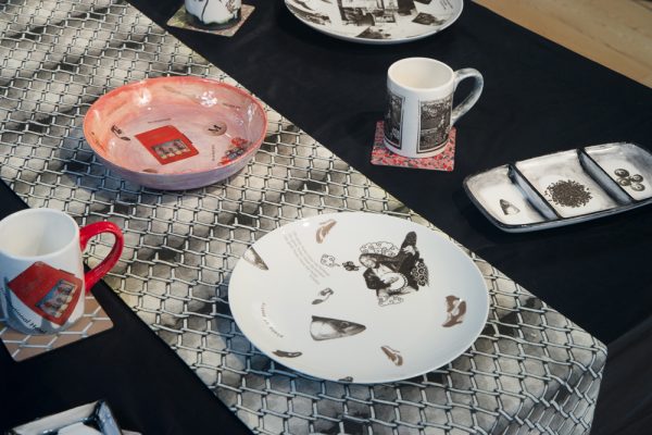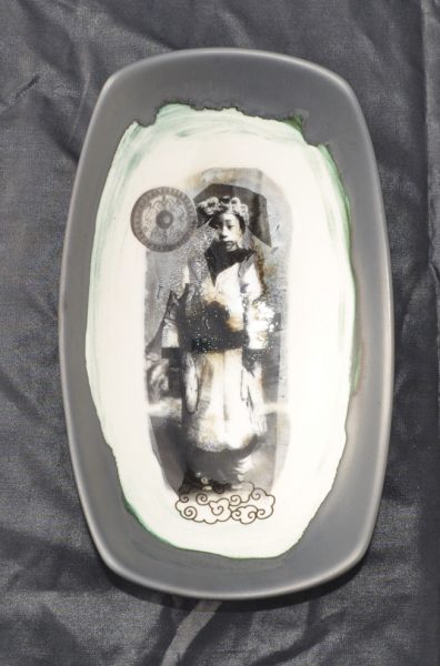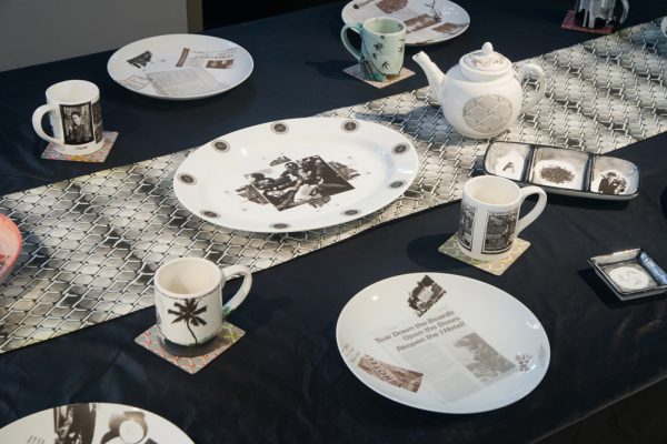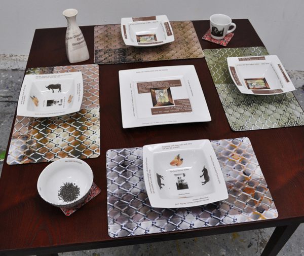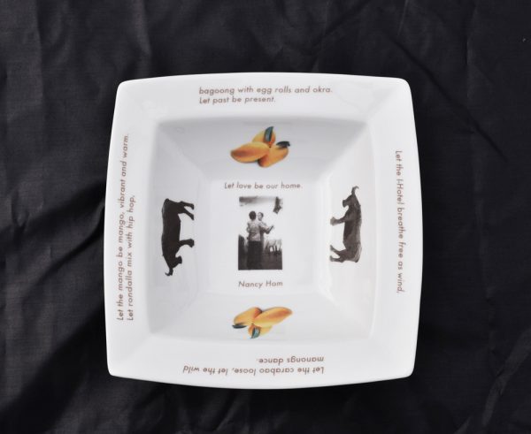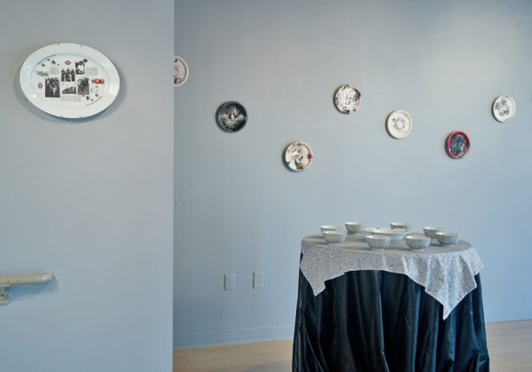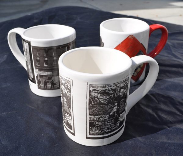 The Placesetting exhibit offers “souvenirs” to display or to use, as works of art, as remembrances or as objects of curiosity. Images from the Manilatown Heritage Foundation’s Archival Project, poems of Al Robles, Serafin Syquia, Nancy Hom, Genny Lim and Oscar Penaranda, saved newspaper articles lent by Mrs, Lee, objects from the Filipino and Chinese community and imagery responding to the metaphors, myths and memories that resonate with the artist’s own experience growing up in the Philippines are fired onto bought and hand cast dinnerware. Digitally printed tablecloths, placemats and coasters are canvases for the installation.