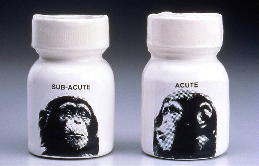 In the series known as RX (Prescriptions), Angel Savage surfaces as C.E.O. of Cargo Cure Pharmaceuticals, the medical branch of Poethig’s International House of Cargo. This fictitious yet formidable corporate conglomerate continues in its tradition of generating the material goods we deify and worship. Last February at San Francisco’s SOMAR Gallery, Angel Savage satirically pedaled her company’s extensive beauty products and formula fashion rituals at the Global Glamour Summit 2000 (visit www.guttergals.com for details.) Today she returns to prescribe everything from Cargo Cure’s advanced pharmaceutical compounds to seductively packaged new age miracle cures.