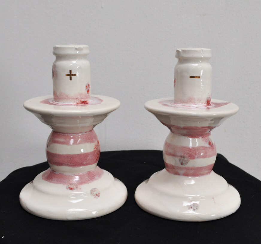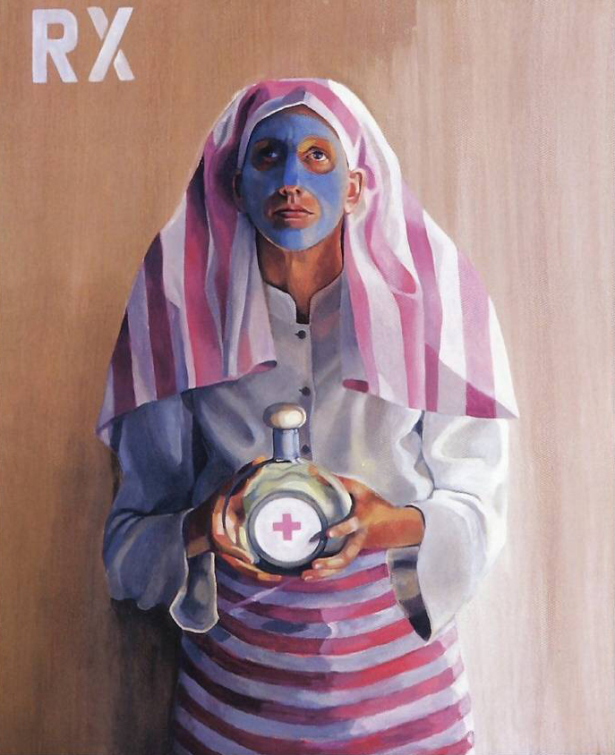 Blessed with the professional authority granted through her highly visible M.D. degree, Dr. Savage dispenses chemical prescriptions that function like hi-tech snake oils. Yet Angel chooses to gently convert her patients—not overpower or intimidate them. She strategically dresses in a non-threatening costume that hybridizes two Western feminine archetypes: the hospital candy-striper and Catholic nun. The pink and white stripes that cover her body and permeate many of these paintings evoke the benevolence of girlish volunteers and matronly missionaries. Their purpose (like hers) is to save our bodies and souls through good deeds and holy insights. Besides that, Angel knows that the look of altruism is “hot” this season—and, more importantly, it sells.