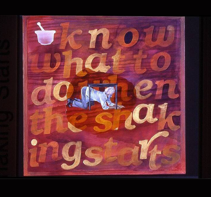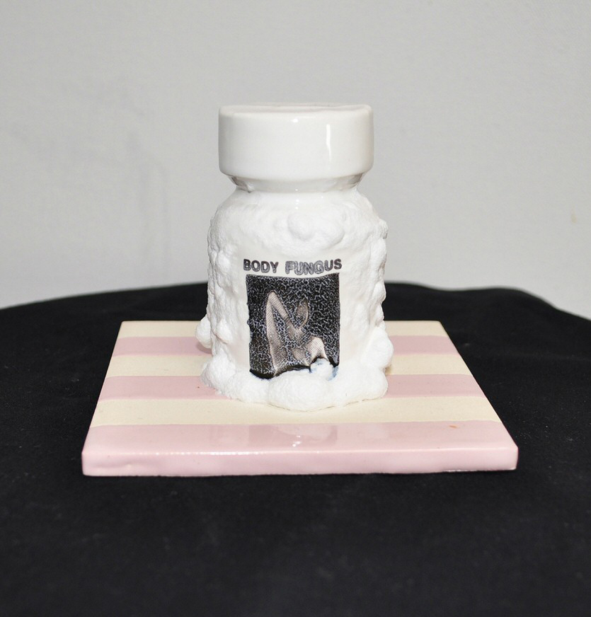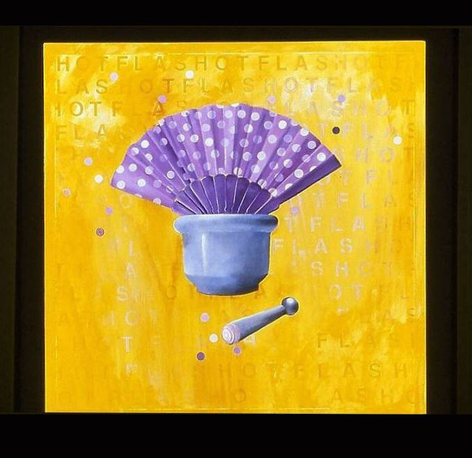In other paintings, like Blue, we are reminded that low-tech therapies exist within nature and the mundane environment. Many “alternative” medical practitioners encourage envisioning a soothing color to heal the body; likewise, Poethig’s elegant rendition of a blue flower on a blue color field suggests that a contemplative walk in the garden might be all the medicine we need. In Hot Flash, a simple white mortar and pestle—the cauldron of pharmaceutical concoctions—is set against a glowing yellow background repeatedly infused with the words “hot flash”. But rather than a mix of chemicals, a festive purple polka dot fan emerges from within the mortar. Perhaps it’s worth remembering that for centuries, a simple hand-held fan sufficed to cool down the menopausal body in place of estrogen pills.