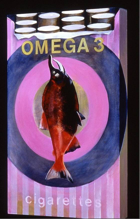 Take, for example, Omega 3. This box-like painting represents a beautifully packaged set of cigarettes infused with Omega 3 oil. This natural oil, derived from salmon, has been scientifically proven to stimulate the human circulatory system. At a time when enjoying a naughty cigarette has become an embarrassing personal stigma rather than the suave, socially acceptable habit of yesteryear, this Cargo Cure product offers smokers a brilliant antidote. We all wish we could rationally justify life-threatening vices, especially the ones that make us feel sexy and relaxed. So why not buy cigarettes that generate positive side effects to counteract carcinogenic ones? Poethig not only envisions this clever technologically advanced product (a playful linguistic pun on “smoked salmon”)—she also references the visual language of traditional Chinese medicine labels in her cigarette package’s graphic design. Omega 3 appeals to our desire for hip “East meets West” solutions to our current pathological dilemmas.