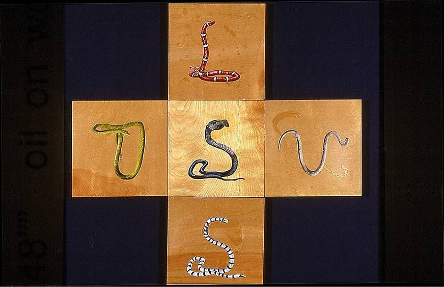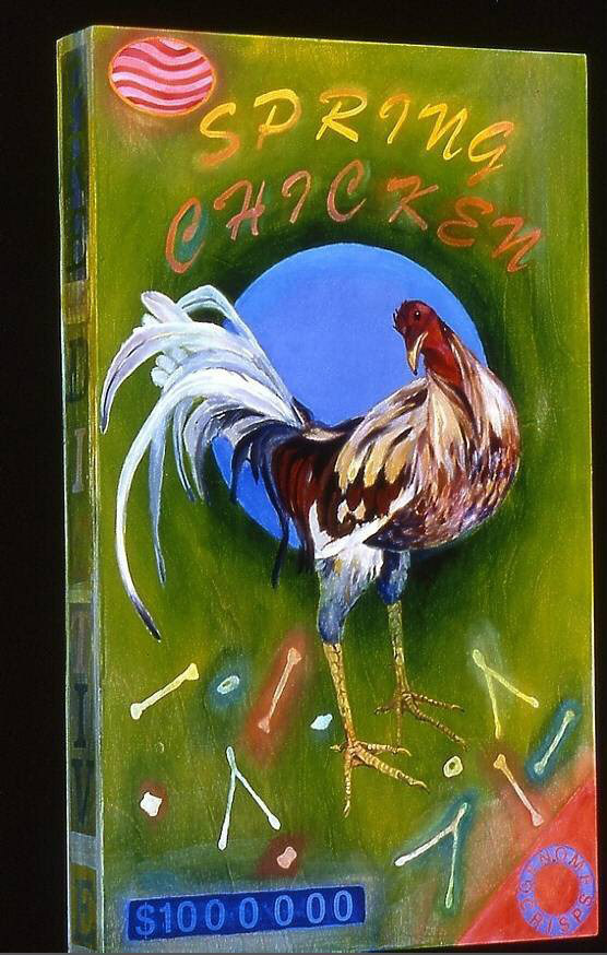 In Spring Chicken: Genomix, we find another of Poethig’s box-paintings, this time simulating a product that conjures the feminine counterpart of the Kellogg Corporation’s rooster logo. Genomix is a crispy, hi-tech convenience food that promises to provide instant Genome Project-generated therapy to keep you looking years younger. It fuses the agricultural industry’s penchant for bio-engineered foods with our human yearning for immortality, as well as our fear of growing old and obsolete in an increasingly impatient, profoundly youth-oriented society.