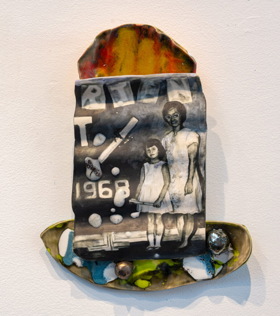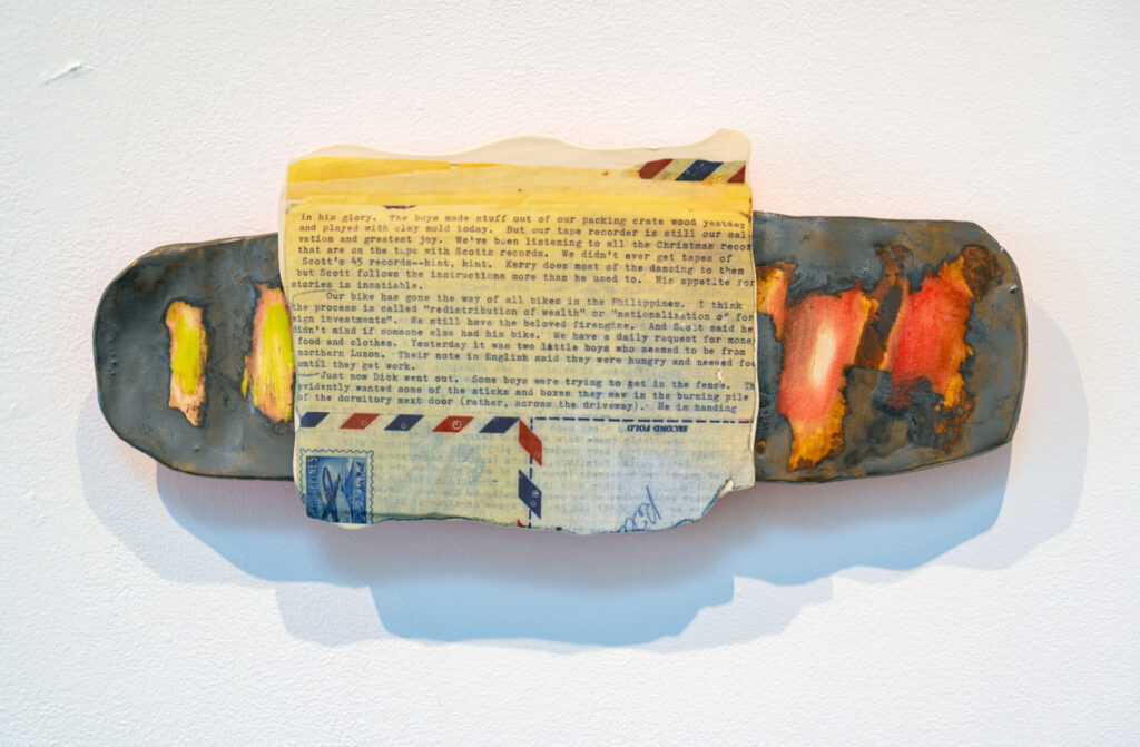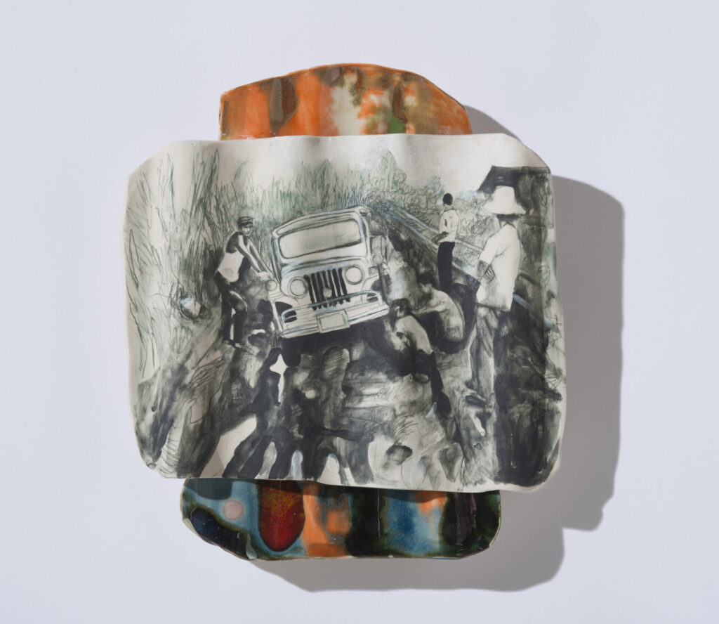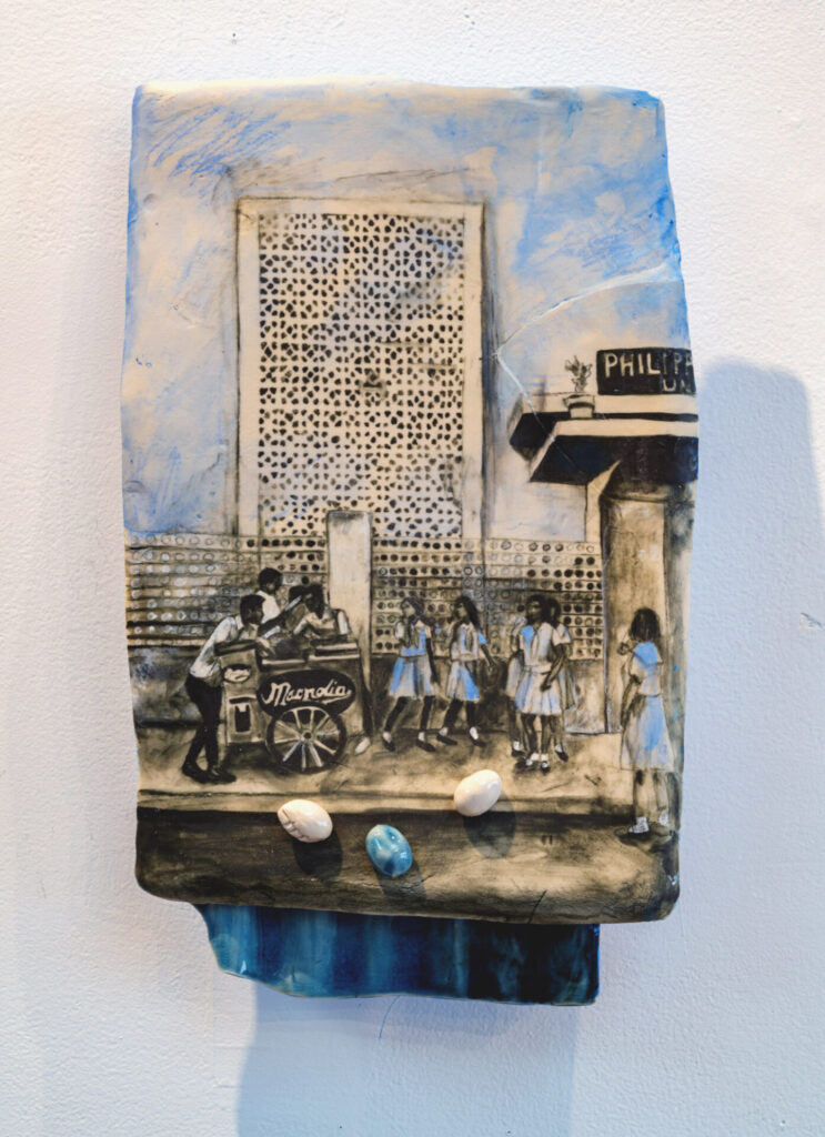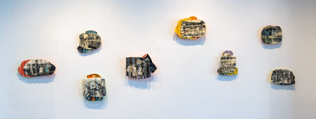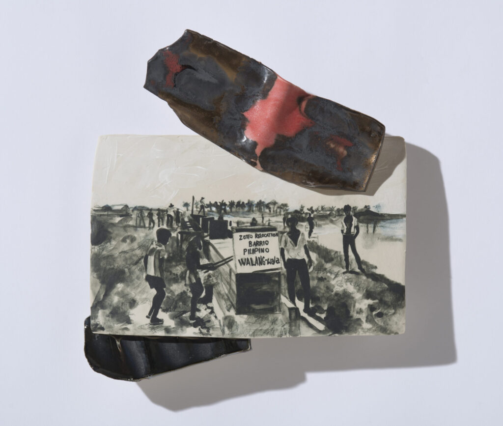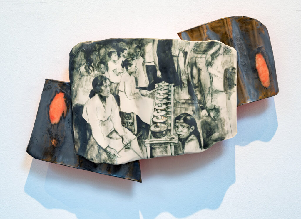 This series of drawings on porcelain shaped as corrugated roofs blown off by typhoons is based on family photos from work, school, vacations and friends of life in the Philippines taken during 1957 – !972. These are drawings of the moments that make up memory, reshaped and reconsidered by the artist’s hand and sealed in the heat of vitrification.