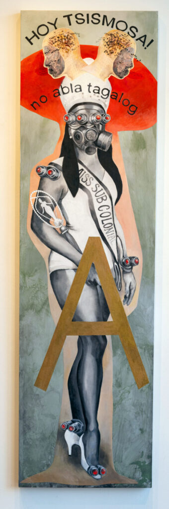 From the WASAK series this iconic painting was originally exhibited in 2008 at YBCA Galleon Trade: Bay Area Now 5 Edition in a collaborative installation with Norberto Roldan. This work examines the post-colonial ironies of the Philippines, its relationship to the US layered in images, icons and the transmutations of language.