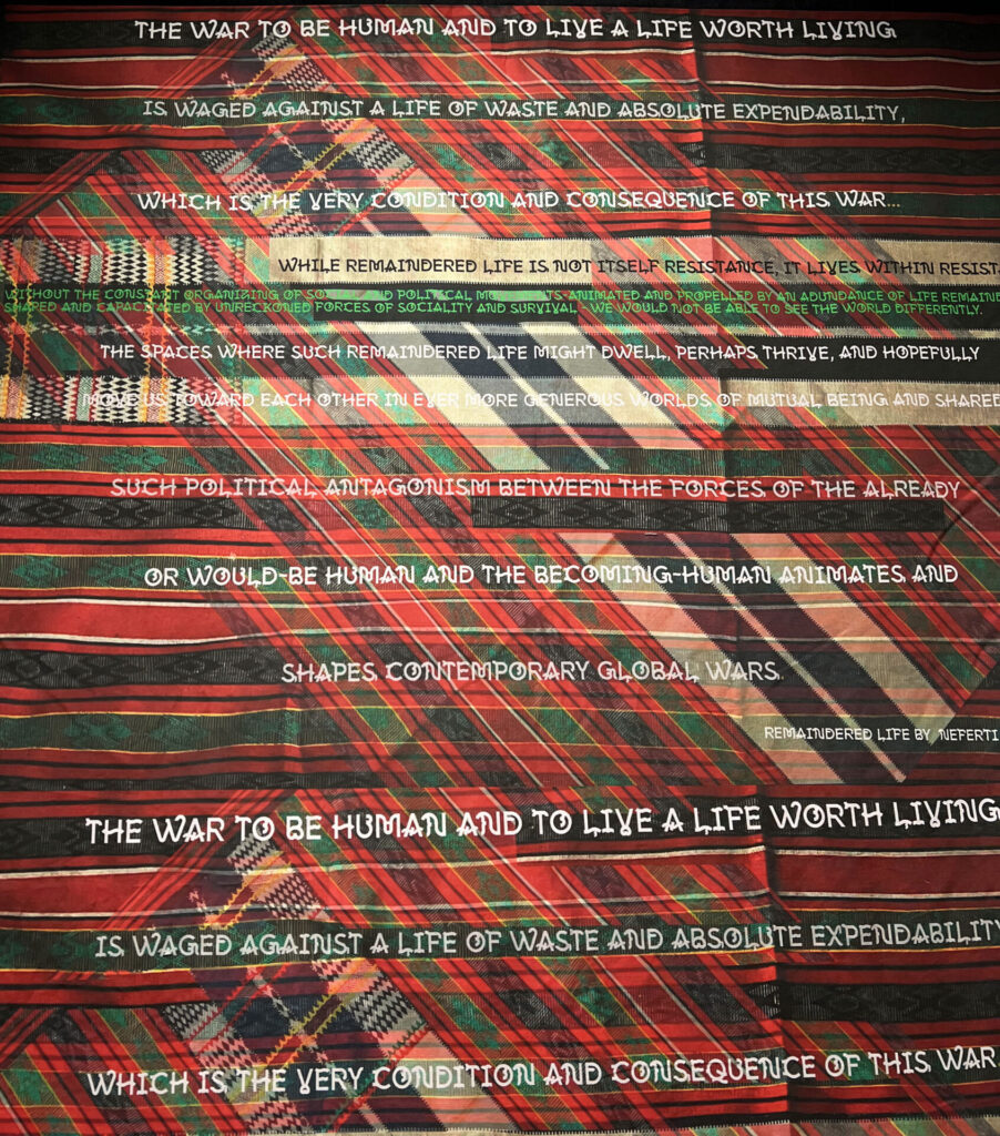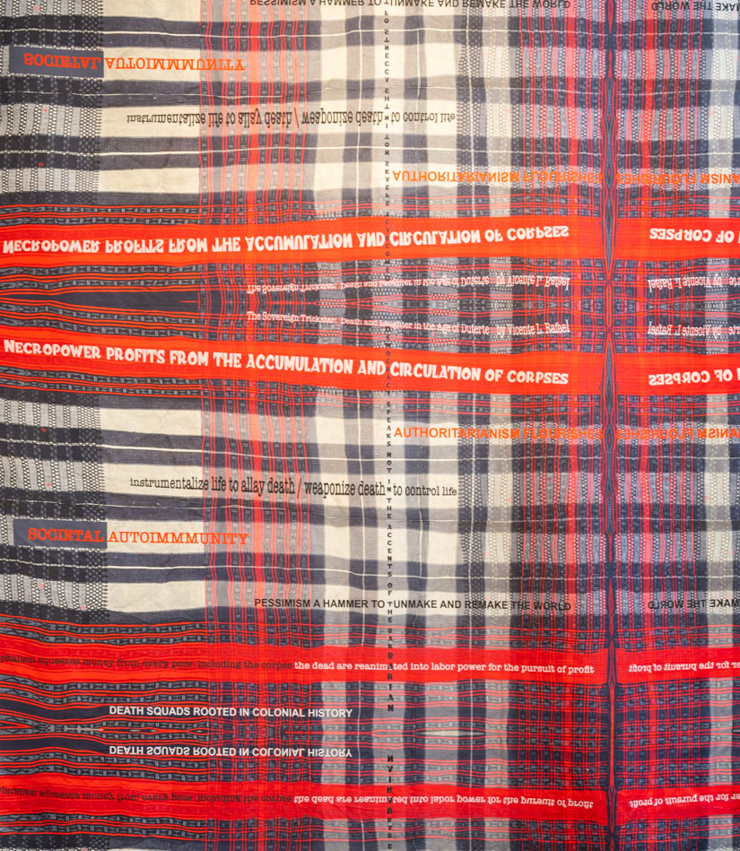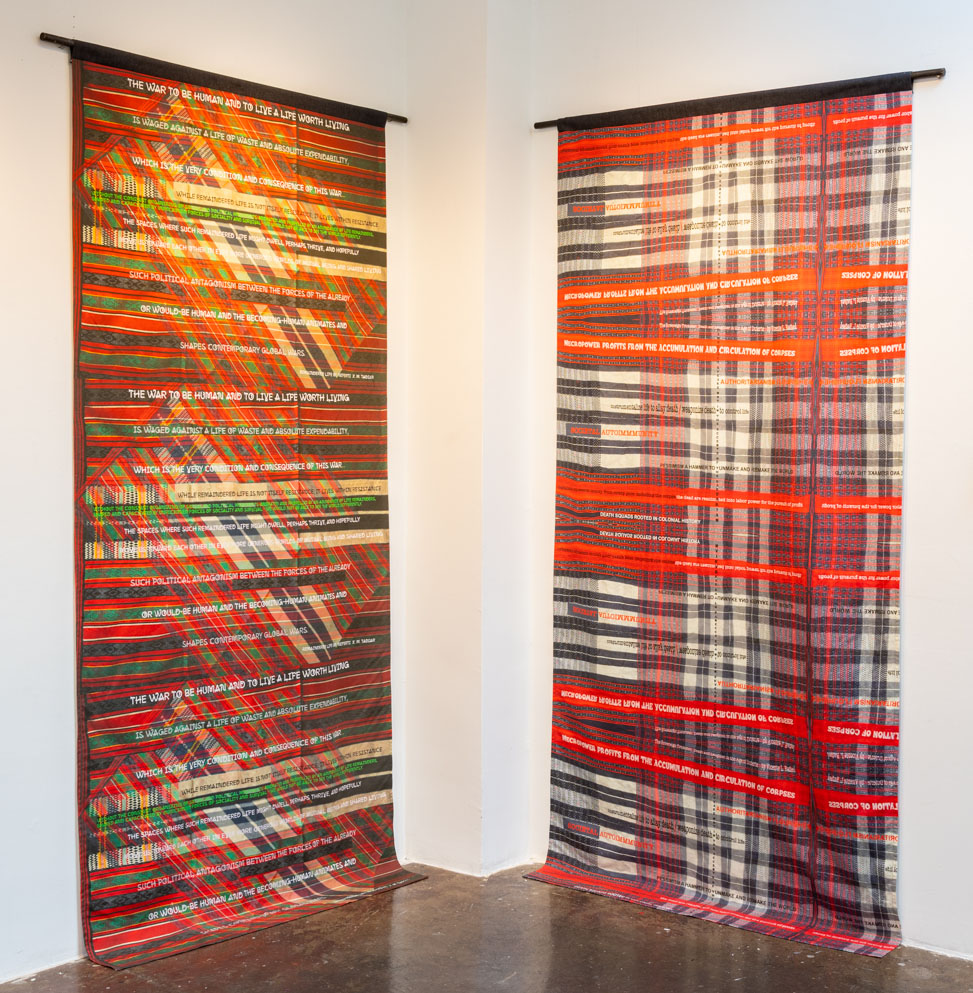 Texts woven into patterns based on traditional weavings from the Philippines become cryptic messages about death, life and the politics of authoritarianism, colonization, imperial war, necropower and quest for a vision of different world. These two Text-tiles integrate excerpts from The Sovereign Trickster by Vicente L. Rafael and Remaindered Life by Neferti X. M. Tadiar.