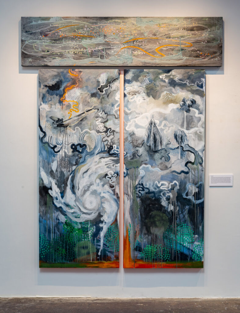 This painting is inspired by Mount Pinatubo, the notorious volcanic eruption on June 15, 1991. This was the second-largest terrestrial eruption of the 20th century. Complicating the eruption was the arrival of Typhoon Yunya which brought a lethal mix of ash and rain to towns and cities surrounding the volcano. The effects of the 1991 eruption were felt worldwide with Global temperatures dropping over the next 2 years. It ejected more particulate into the stratosphere than any eruption since Krakatoa in 1883. With US Clark Airforce base covered in ash it was the final step to closing American bases in the Philippines.