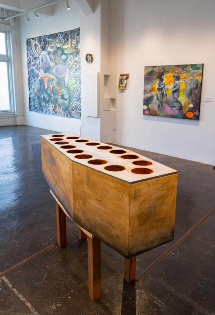 Ungkat means to recall in Tagalog. Most Shell Games are a confidence trick, a conjuring where legitimacy is always in question. Informed and inspired by Poethig’s formative years in the Philippines, identity, memory, perspective, views of empire, legitimacy and connection weave through this body of work. Poethig, is a visual, public and performance artist with a legacy and expanding body of work that bridges diverse communities through murals, public art projects, exhibitions and collaborations in the Bay Area, nationally and internationally. Featured work includes: