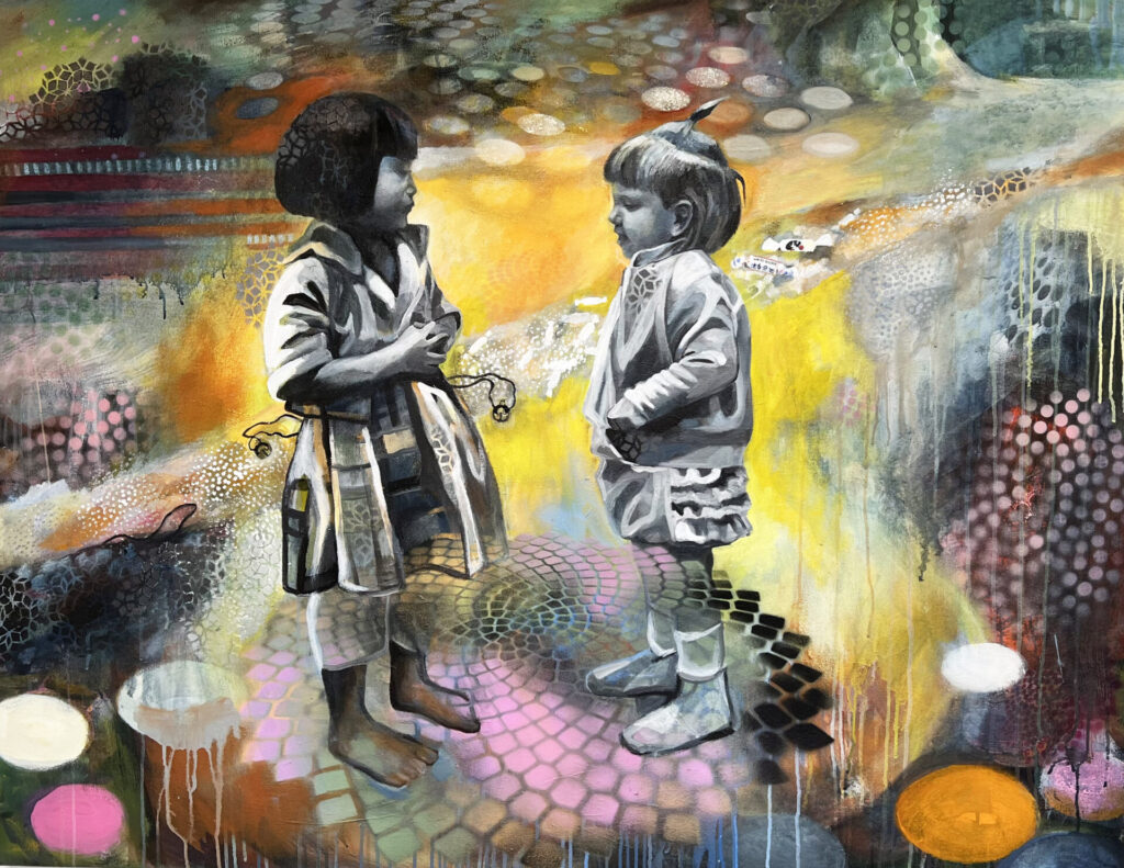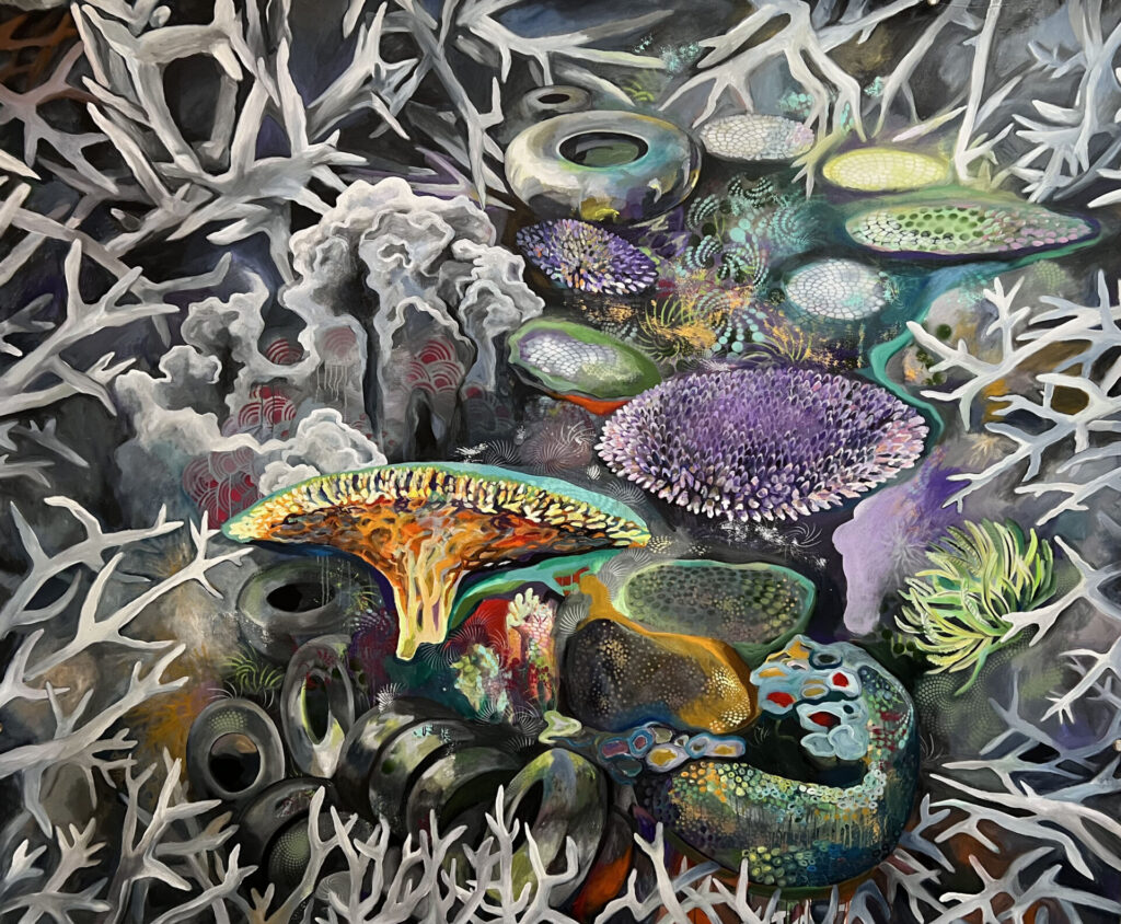 Threat and beauty entangle in this painting. The Philippines, Malaysia and Indonesia make up the Coral Triangle in Southeast Asia. Coral reefs have experienced mass bleaching which threatens to degrade the important ecosystems that support biodiversity, food security and livelihood. The use of tires meant to create new reefs end up breaking down and becoming toxic adding to the disaster facing the coral colonies of the Philippine seas.