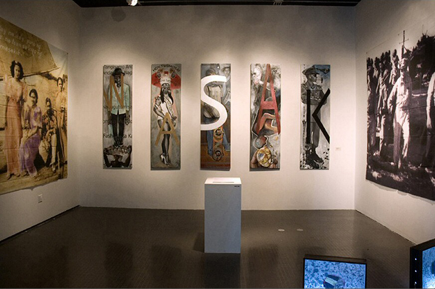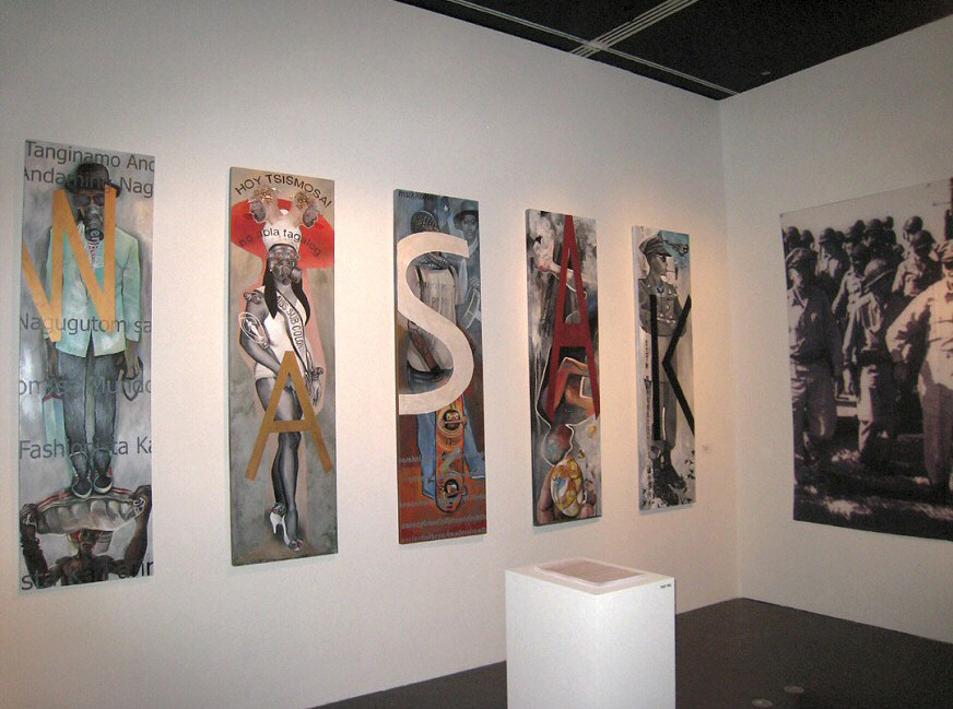Roldan’s 2 banners are excerpted from a larger body of work, some of which is also being shown concurrently in his retrospective in Manila. The binaries and contradictions set up in the opposing banners-feminine/passive/host country, and masculine/militaristic/occupying force, pushes subtly back against some of the mythologies of benign American governance and war heroism in the Philippines, as often exemplified by General Douglas MacArthur.