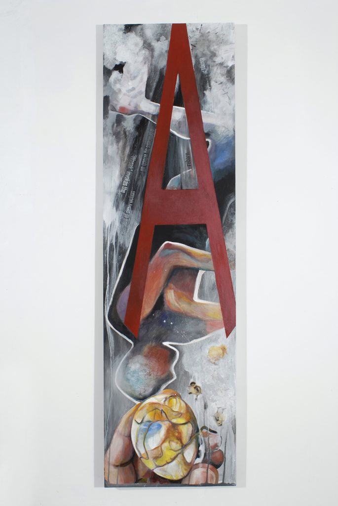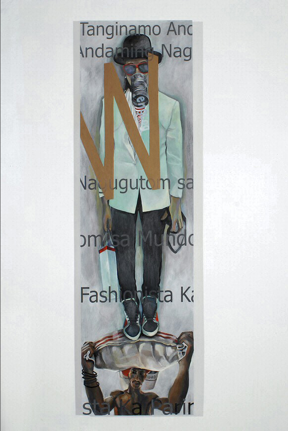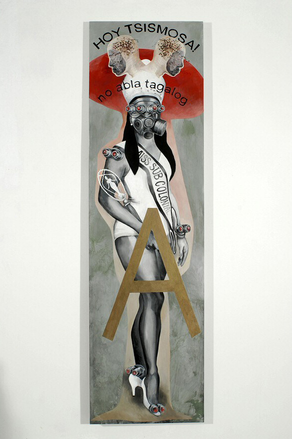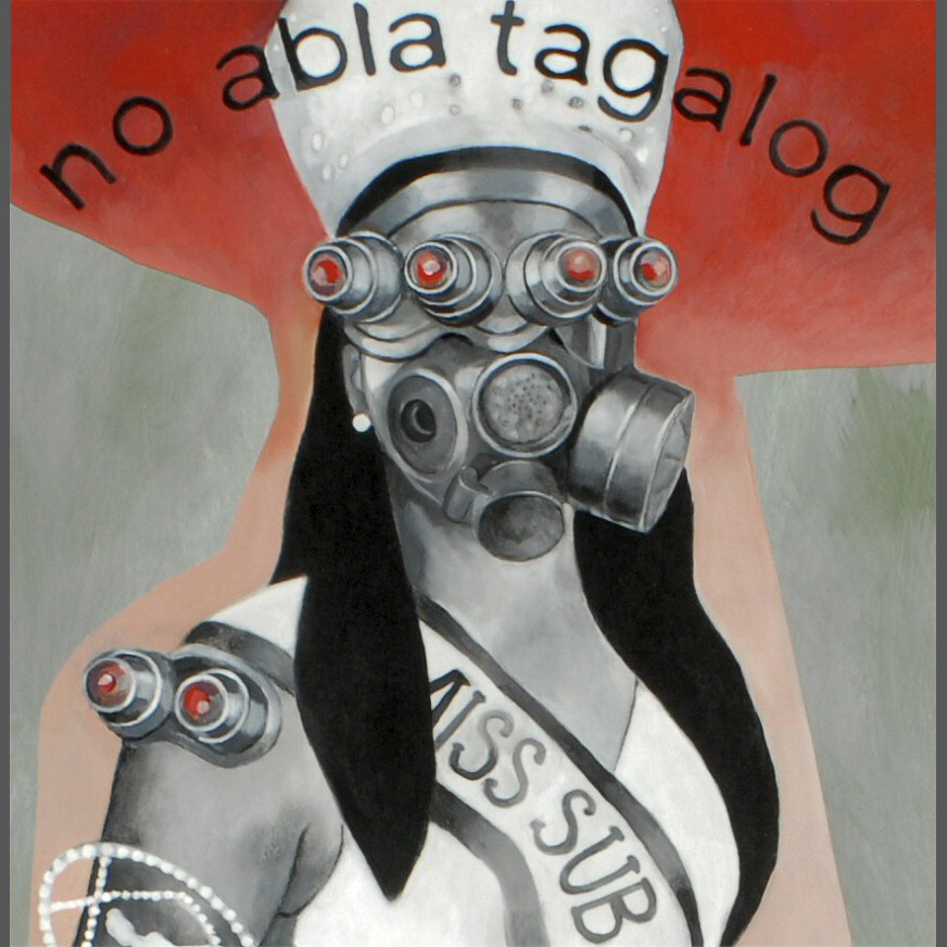 The complex meaning of the word “Wasak” is somewhat indirect, and best elicited by reading the manifesto itself. Poethig’s paintings use excerpts from the actual text as well as “taglish” and “englog” sources and an album title by Lourd De Veyra, “Tanginamo Andamin Nagugutom sa Mundo Fashionista Ka Parin” (“Mother—ker, people are starving and you are still a fashionista”). This work examines the post-colonial ironies of the Philippines, its relationship to the US layered in images, icons and the transmutations of language.