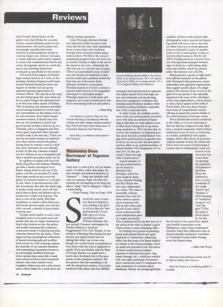 In their first music video, “Pobreng Alindahaw” they process a beautiful song from the Visayas region of the Philippines through several layers of sound and video manipulations. Images of the “poor butterfly that has no place to land” flutter through skies with helicopters and stealth bombers. Their video, “Sarung Banggi”, has mythological elements of the universe, the romancing of deities and mysterious figures involved in subversive activities. “Barrionics does Barrioque” plays with the aesthetics, passions and politics of baroque traditions and transculturalizations. The result are works of art that cross cultural aesthetics in several directions. “In Search of Kwan” is a new body of work exploring the essence of “Kwan”, the great among, the unspeakable, the invisible, the inaudible. “Kwan” is a speech disfluency in Pilipino occurring similarly like “um” or “like” in speaking when there is a break in speech pattern or a-loss-for-words. The occurrence of “Kwan” in spoken Pilipino offers an insight to the way consciousness is negotiated with others. Barrionics video, performance and experimental sound compositions use sweet song metaphors to explore musical styles and political points of view while never losing a sense of “camp”.