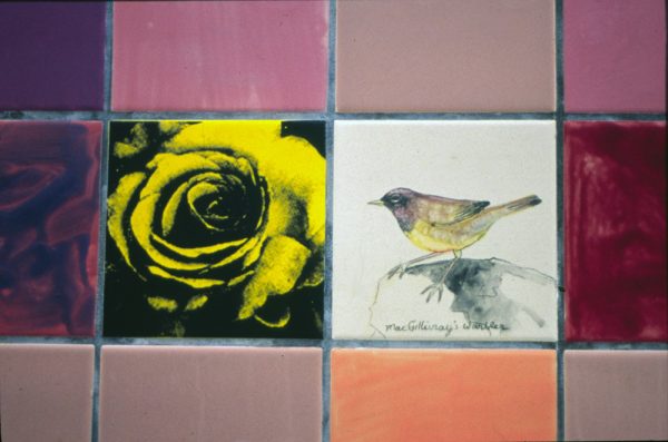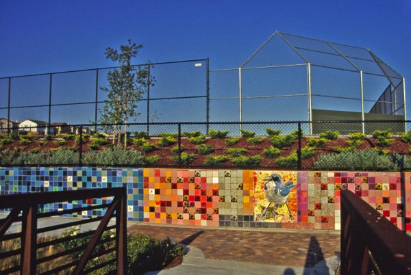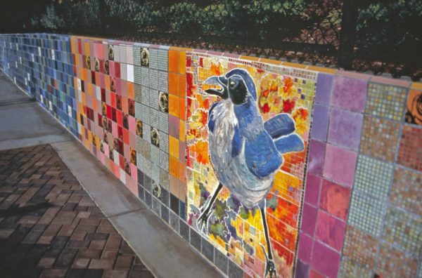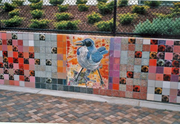 This public art work celebrates the birds of California with a 4 foot hand built Scrub Jay as the centerpiece and hand painted birds with their names set throughout tile wall. Commissioned by the Dublin Fine Arts Foundation.