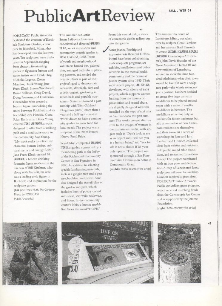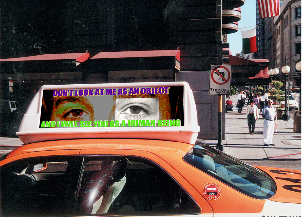 These Cab Top Ads are the result of a collaboration between Johanna Poethig, expressive arts therapist Delfina Piretti and women from SAGE, an organization serving women who have worked in the sex industry. These “art ads” were created with women in SAGE project recovering from abuse and violence. They are digitally designed public art works installed on the tops of taxi cabs in San Francisco. These works present alternatives from the sexualized and exploitative images of women in mainstream media. As Cab Top Ads, the images of eyes and related texts use the same vehicle, both advertising and the cab, with completely new intentions.