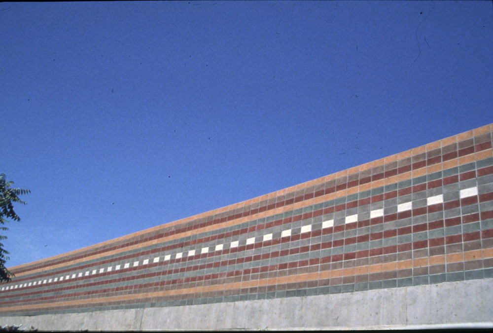 (14′ x 2000′ ) Brick and concrete. Design team with Architect Brian Laczko. This soundwall is a “weave” of textiles expressive of Stockton’s diverse population. Beginning with the Filipino malong along the freeway on-ramp transforming to Laotian boat shapes, to Mayan zigzag design to American quilt patterns and Native American basket weave. Commissioned by CalTrans through the Stockton Public Art Program.