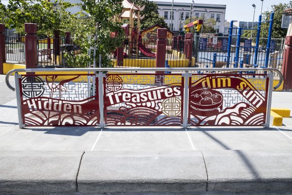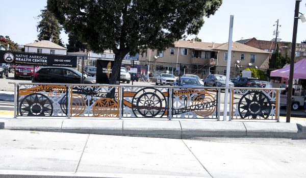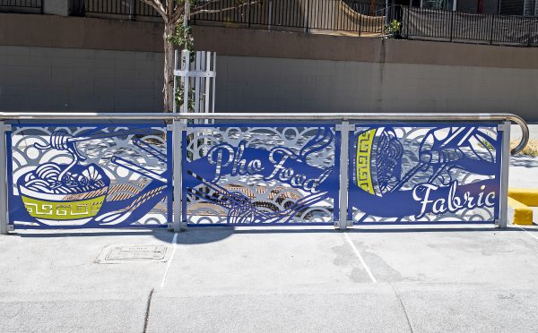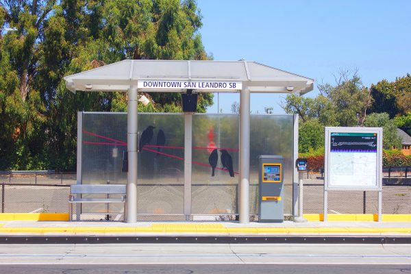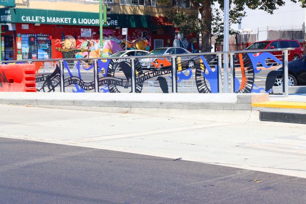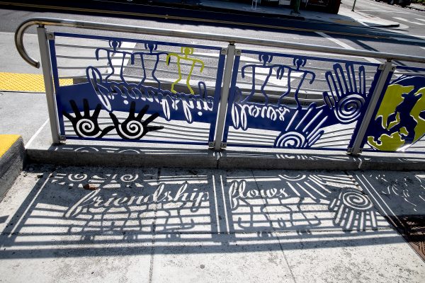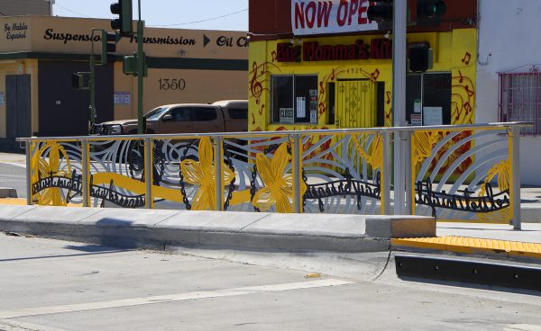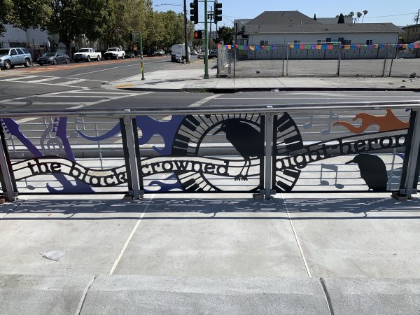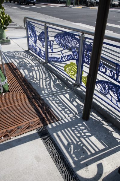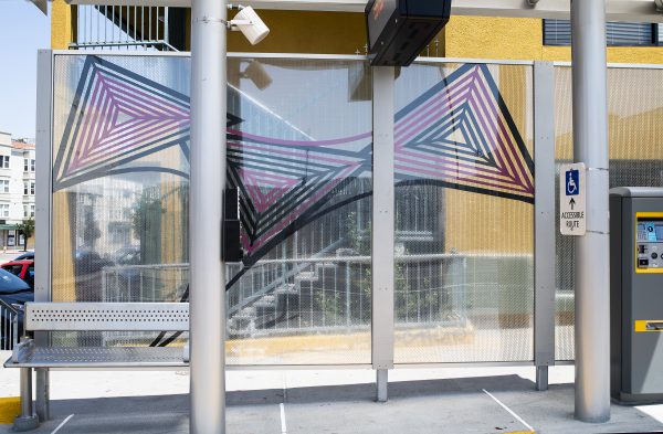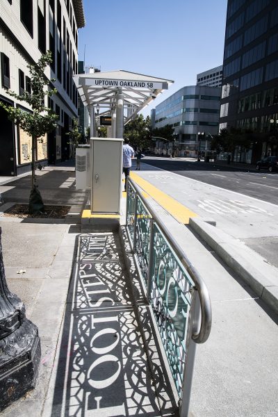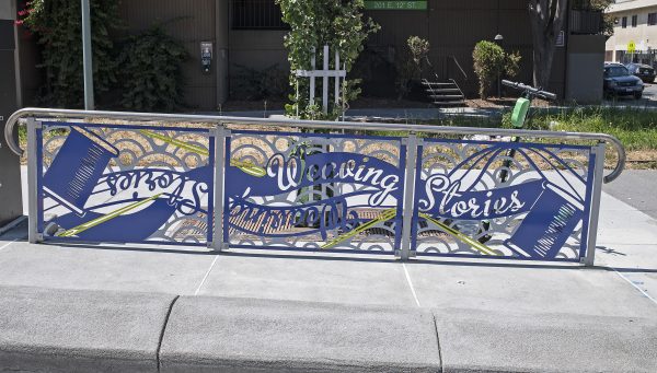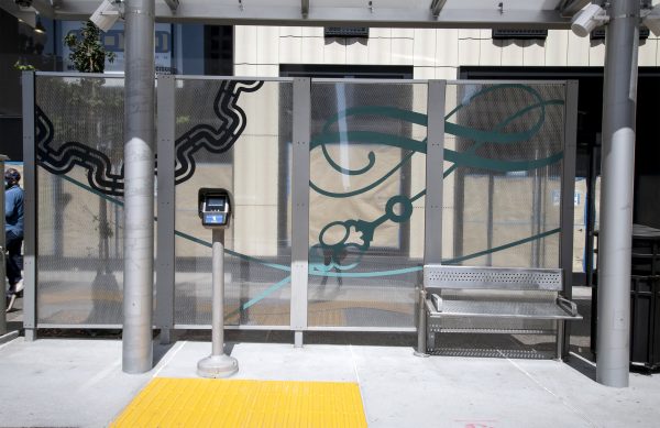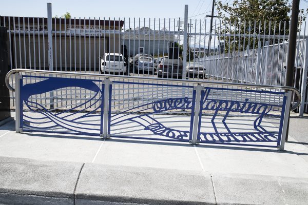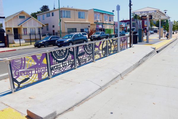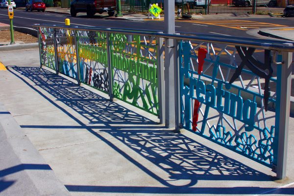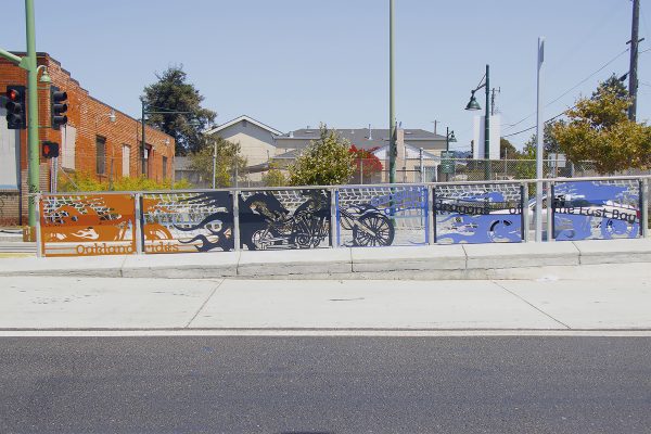 Cultural Corridor/Urban Flow is a 9 mile, 1.5 million public art work created with Lead Artist Johanna Poethig, Mildred Howard, Peter Richards, Joyce Hsu which employs a ribbon of words and neighborhood iconography to enhance the new AC Transit Bus Rapid Transit (BRT) Line that connects downtown Oakland, International Boulevard, to San Leandro. Workshops with Oakland’s “Youth Uprising”, San Leandro residents and the broader community, informed, inspired and guided the artists design process. Local poet and writer Elmaz Abinader contributed to the text as it was developed resulting in a 9mile long poem. Light responsive honeycomb-hex panels, designed for the Enhanced Stations, punctuates the lively visual environment as they respond to people and vehicles moving by. Each Station is a landmark riffing on the unique cultural and social environment of the surrounding neighborhood. Cultural Corridor/Urban Flow considers transportation in the context of all the human constructed systems which enable us to live and prosper on this planet. Moving people and goods freely from one place to another, along with education, communication, commerce, clean water, energy, waste management are just a few of the ways we have devised to provide for fulfilling lives. A sign of a healthy society is when all of these systems flow together in harmony. This is an unfolding work of art that offers a continuous experience of discovery along the TEMPO BRT route.