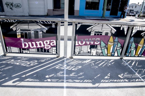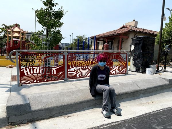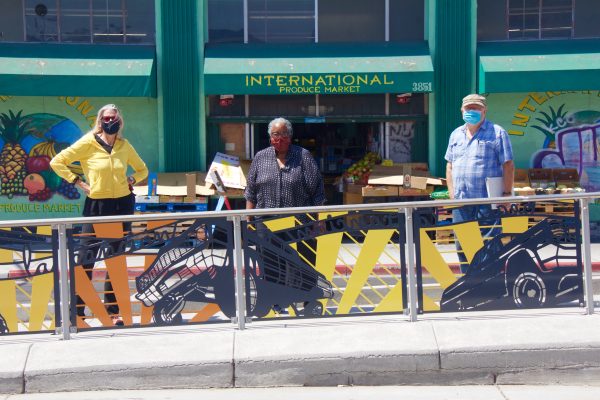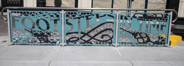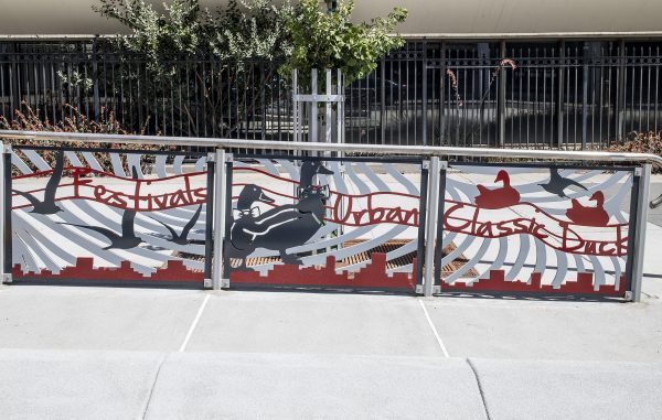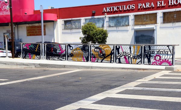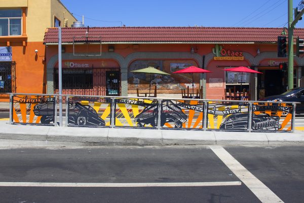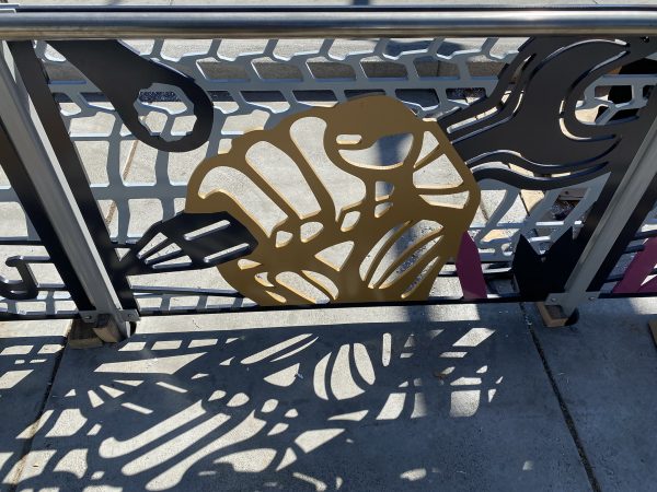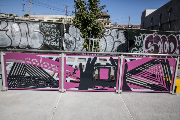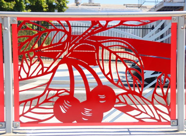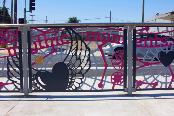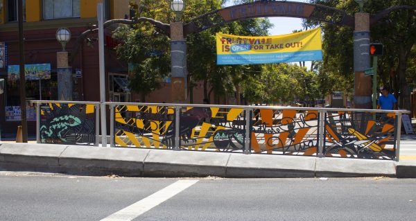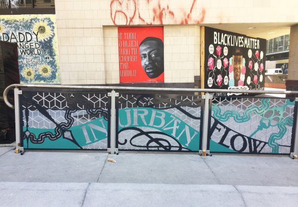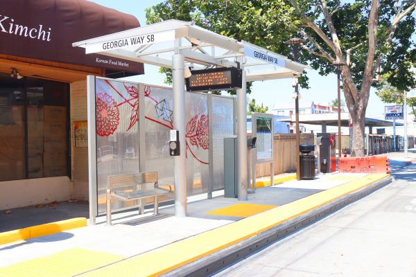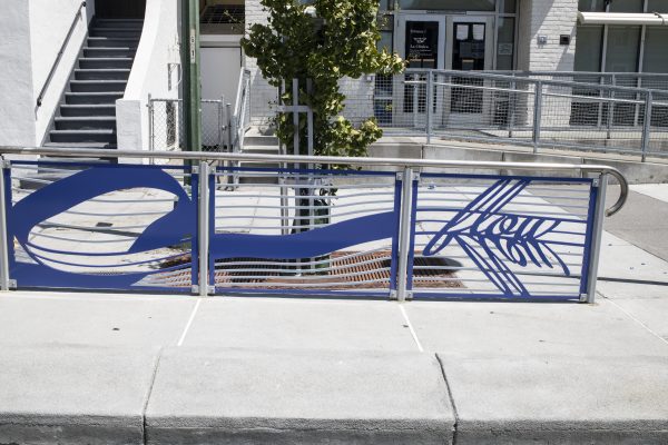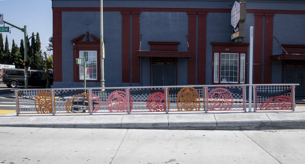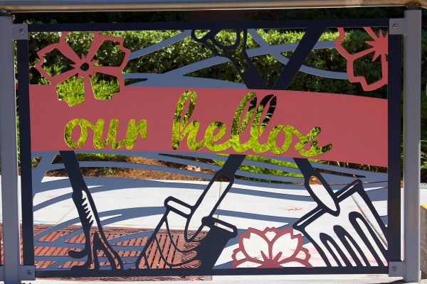 Cultural Corridor/Urban Flow is a 9 mile, 1.5 million public art work created with Lead Artist Johanna Poethig, Mildred Howard, Peter Richards, Joyce Hsu which employs a ribbon of words and neighborhood iconography to enhance the new AC Transit Bus Rapid Transit (BRT) Line that connects downtown Oakland, International Boulevard, to San Leandro. Workshops with Oakland’s “Youth Uprising”, San Leandro residents and the broader community, informed, inspired and guided the artists design process. Local poet and writer Elmaz Abinader contributed to the text as it was developed resulting in a 9mile long poem. Light responsive honeycomb-hex panels, designed for the Enhanced Stations, punctuates the lively visual environment as they respond to people and vehicles moving by. Each Station is a landmark riffing on the unique cultural and social environment of the surrounding neighborhood. Cultural Corridor/Urban Flow considers transportation in the context of all the human constructed systems which enable us to live and prosper on this planet. Moving people and goods freely from one place to another, along with education, communication, commerce, clean water, energy, waste management are just a few of the ways we have devised to provide for fulfilling lives. A sign of a healthy society is when all of these systems flow together in harmony. This is an unfolding work of art that offers a continuous experience of discovery along the TEMPO BRT route.