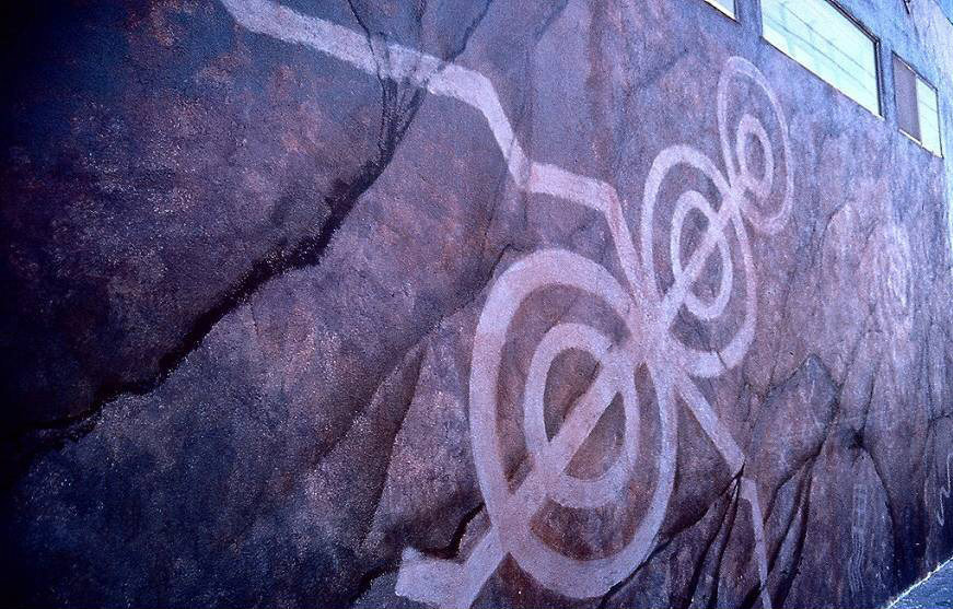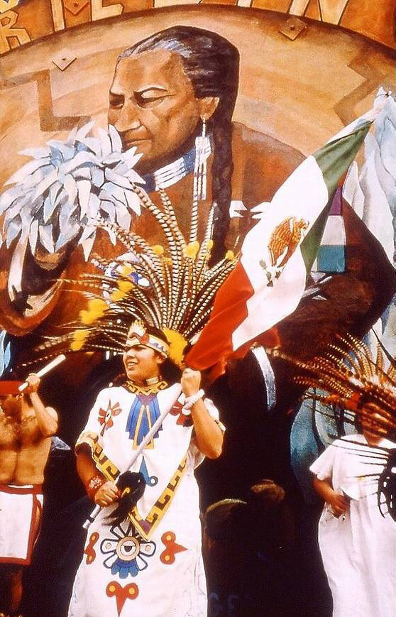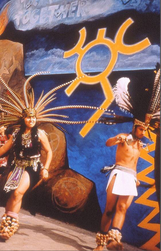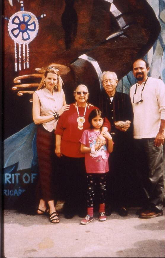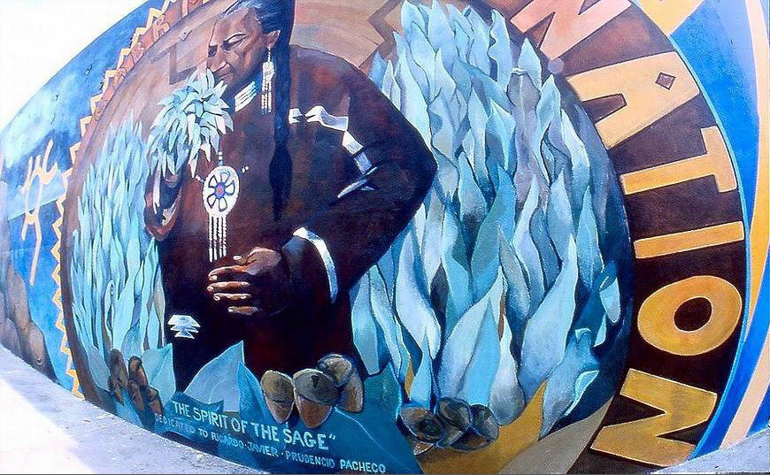 This mural is a tribute to the Gabrielinos who originally lived in this area of Southern California. The Sage ceremony at the dedication of the mural was led by Manuel Rocha, spiritual leader of the tribe. Vera Rocha, political leader of the present day Garielinos, portrait is the centerpiece of the mural. Commissioned by the Social and Public Art Resource Center and the Los Angeles Cultural Affairs Department.