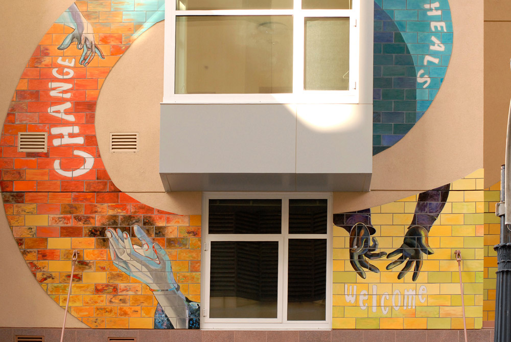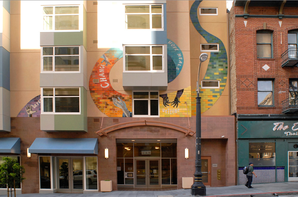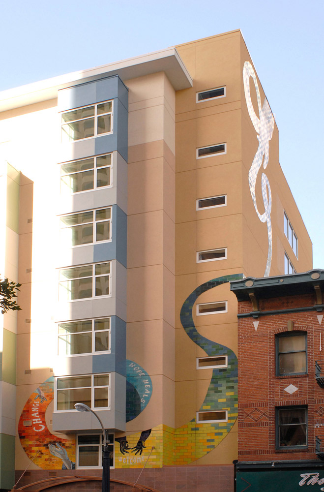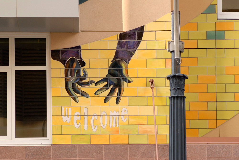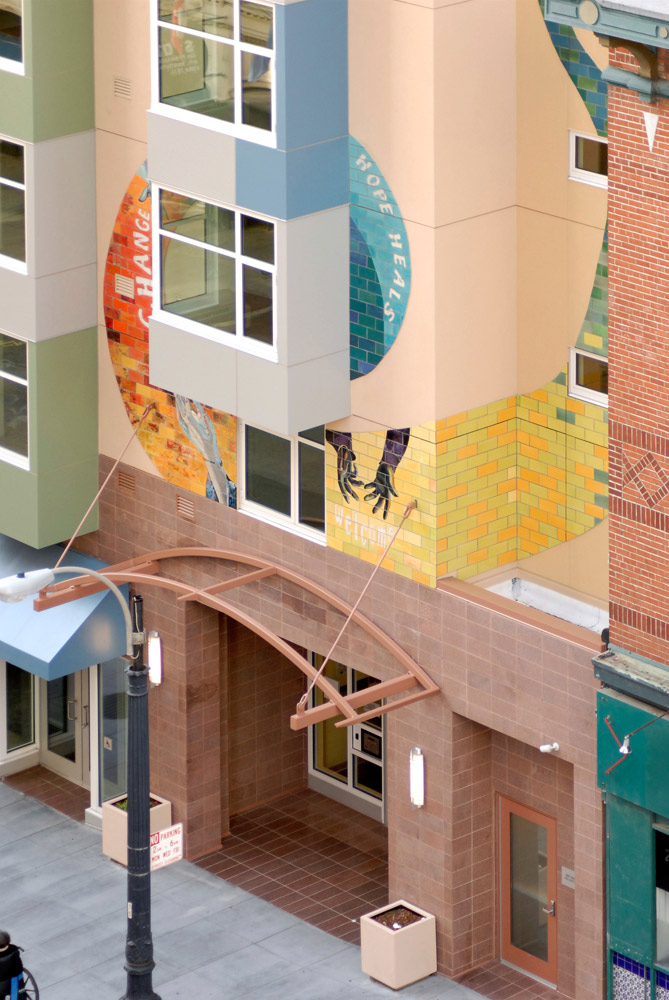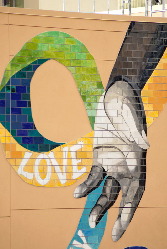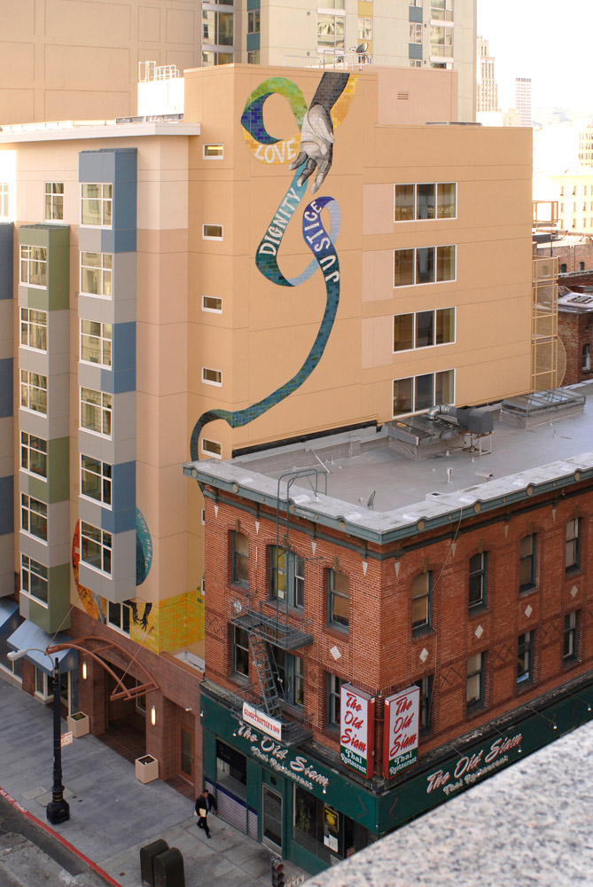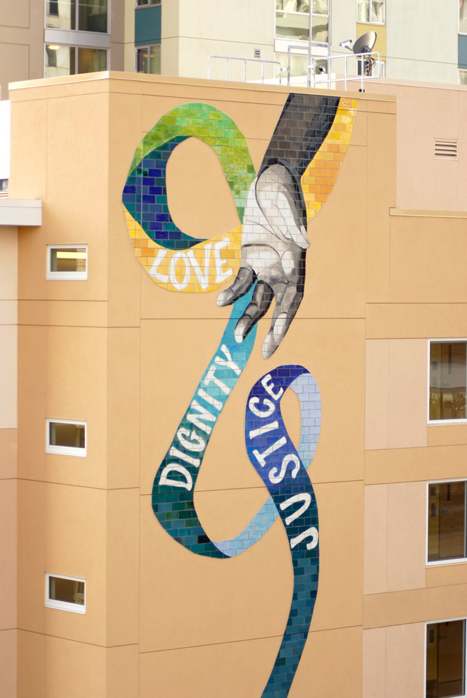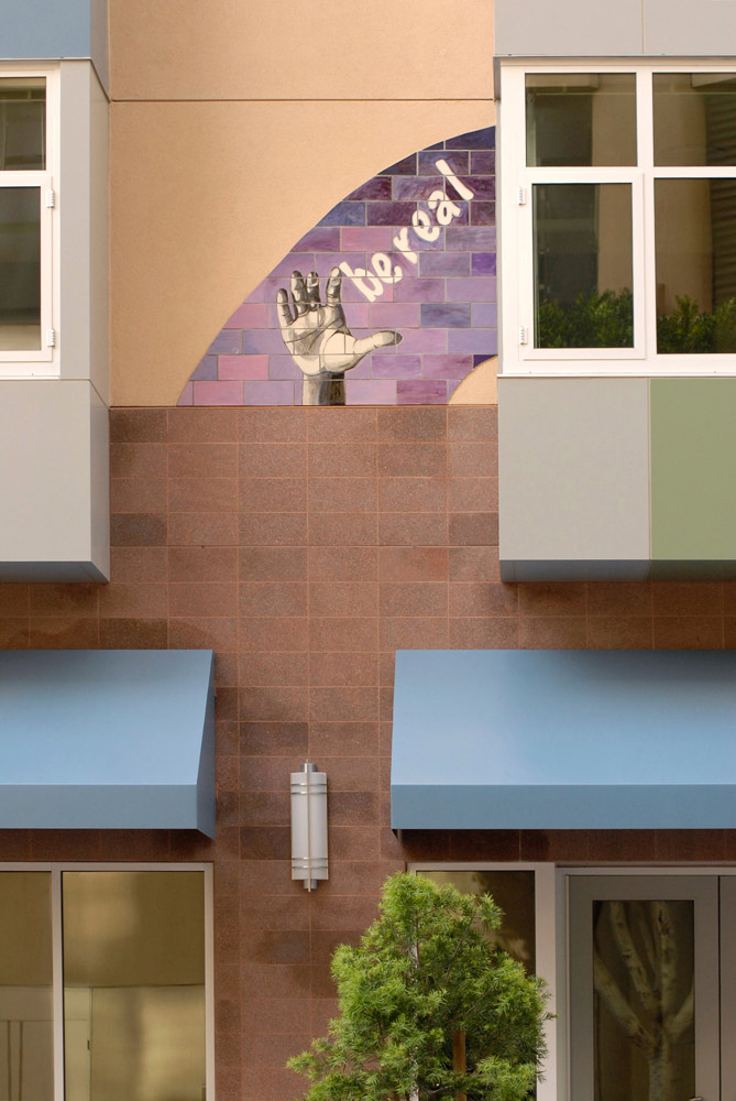 INTERTWINED was created for 149 Mason Street Studios, new low income housing for the chronically homeless in downtown San Francisco’s Tenderloin neighborhood. It is aesthetically significant as it both integrates with the physical qualities of the building architecture and the social commitment this new housing reflects. The words were selected in collaboration with the Glide Community. Glide is “ radically inclusive, just and loving community mobilized to alleviate suffering and break the cycles of poverty and marginalization”. This artwork is a hand-cut and glazed ceramic ribbon that wraps the 8 story building starting at the entrance and then around the side to the top of the building. Within this “Intertwined ” ribbon hands open in gestures of sharing, grace and community. “Intertwined” is influenced by Poethig’s three decades of creative collaborations with communities in San Francisco’s Tenderloin neighborhood, with the Vietnamese Youth Development Center, children at Boedekker Park, murals for the Southeast Asian Refugee Resettlement Center and the “Tenderloin National Forest”, the 509 Cultural Center’s alleyway revitalization project.