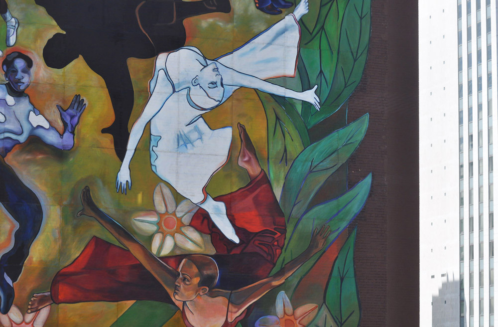 “Loop Tattoo” , 135′ x 45′, is installed on the side of 63 East Lake street between Michigan and Wabash in Chicago’s downtown loop. The mural was designed by Poethig and painted with a team of Chicago community muralists/artists in a studio space on the corner of Wabash and Monroe. The public passing by could watch the mural unfold in 270 5’x5′ sections through the large glass windows that spanned the corner studio. The mural is now emblazoned on the 24 story historic building celebrating this vibrant downtown neighborhood, business district and its rich cultural life. It is part of the public art tour of downtown Chicago that includes the nearby Millennium Park . The Chicago Public Art Group (CPAG) coordinated the mural painting and installation in its role as the Artistic Directing Agency.