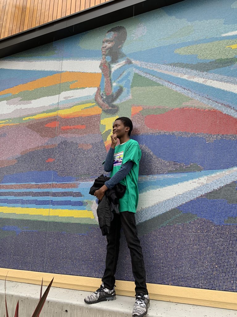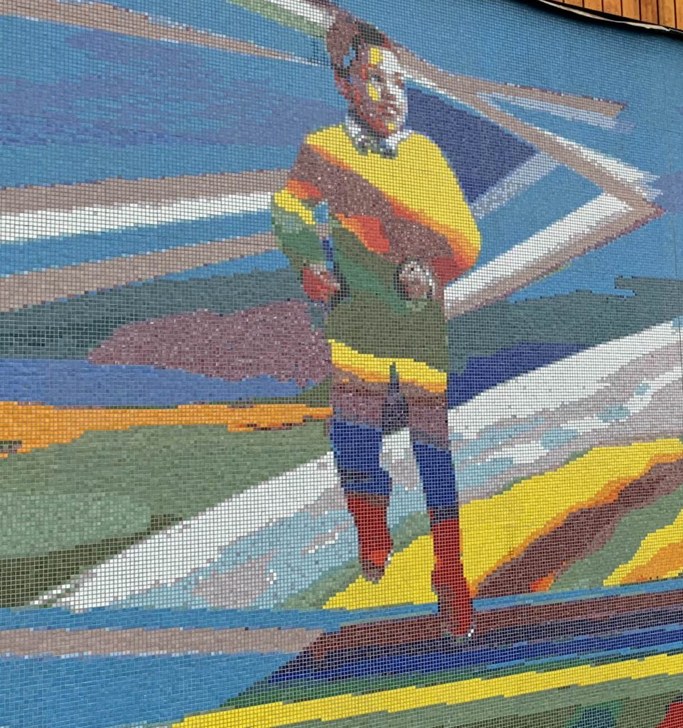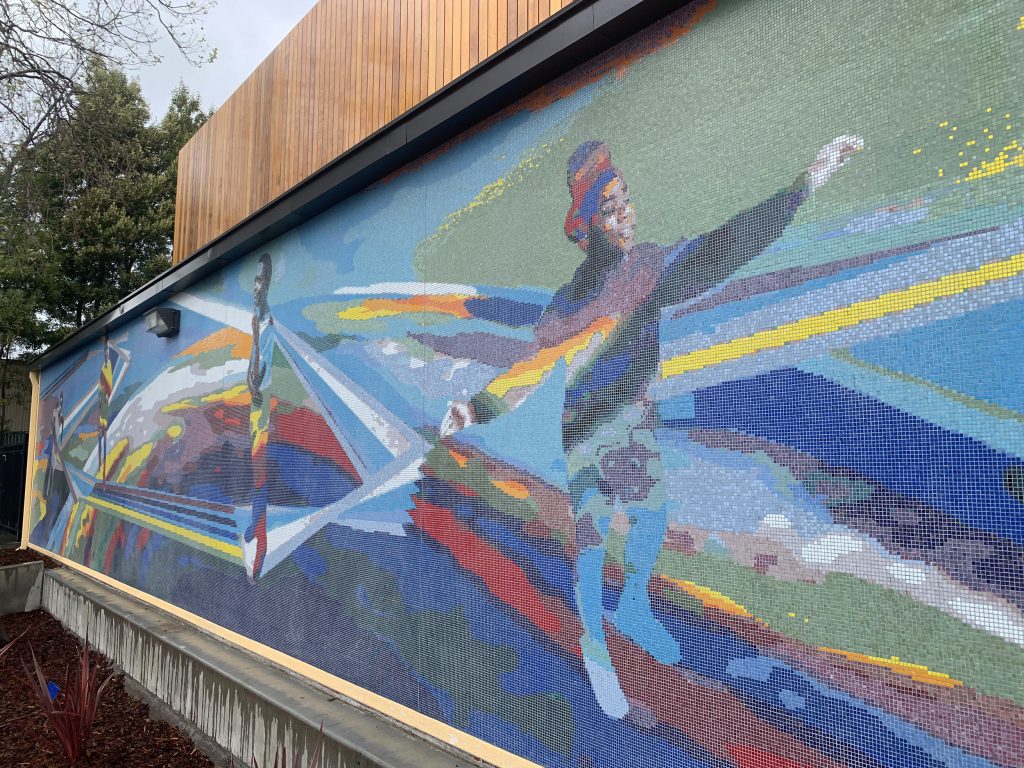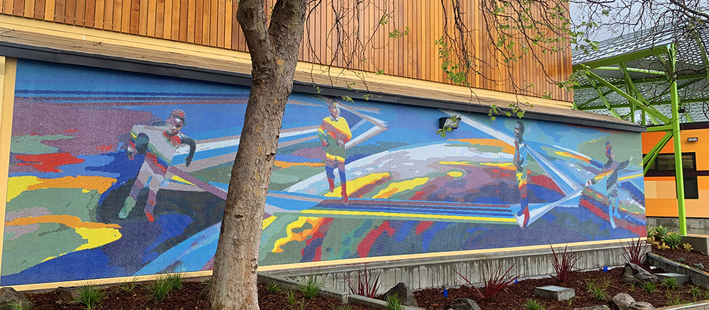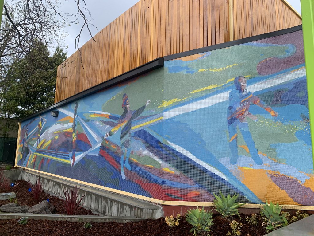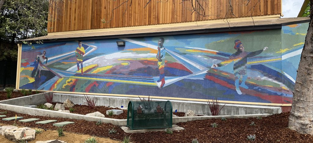 This glass mosaic spans the front stucco walls of the Rainbow Recreation Center entrance. A rainbow landscape inspired by the surface of bubbles creates a colorful backdrop for figures. The figures are based on photographs of youth that are connected through their gestures. Art and science come together as the gestural figures refract light that passes through them. Reflection, refraction and diffraction are all boundary behaviors of waves associated with the bending of the path of a wave. This is what creates rainbows. The wavelengths connect the figures in a metaphor for the sharing of our ideas, culture and friendship. Culture interacts with the individual like light refracting through glass or water. Going back to the work of Morrie Turner for whom this recreation center is named this is an homage to the phrase that he coined “Rainbow Power”.