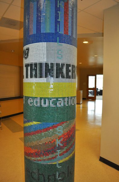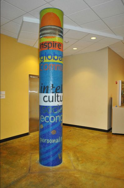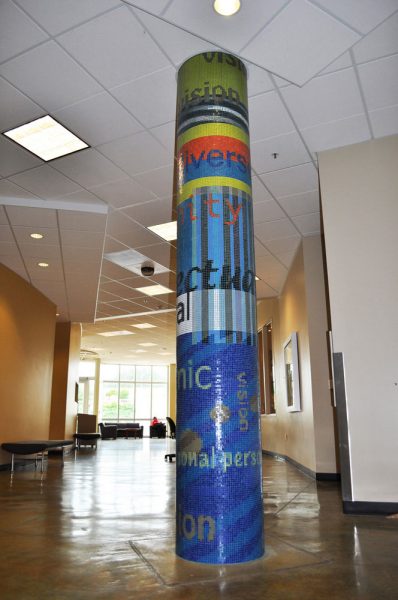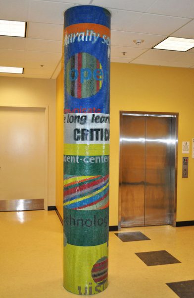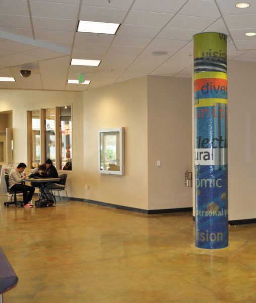 The “Vision” and “Mission” glass mosaic pillars , (11′ x 5′ circumference) are located on the first and second floor of the Student and Community Center of Skyline College in the Bay Area. As a gathering place for the Skyline community this artwork is designed to transform the space with a colorful tapestry of text taken from the Vision and Mission Statements of Skyline College. The visual intention of this artwork is to enliven the institutionally neutral hallways with rich color, strong design, and thematic content conceptually linking the two floors.