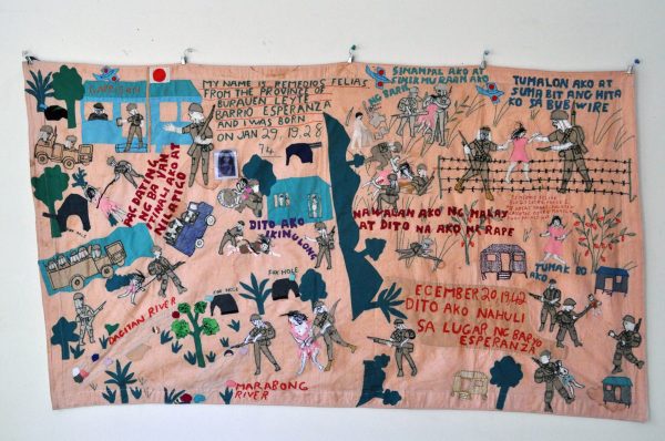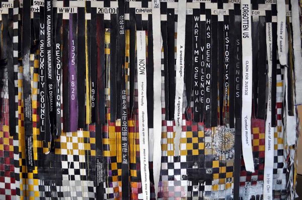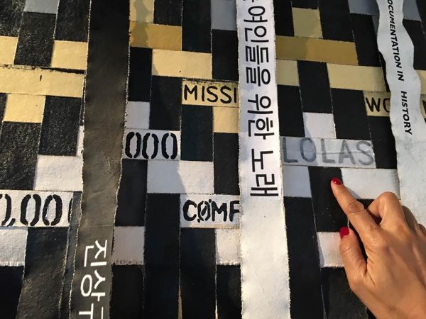 Visual and Public Art Department (VPA), CSU,Monterey Bay: The first presentation of this memorial in Spring 2016 included M. Evelina Galang presenting her work with the Lolas, artist Claudia Bernardi who works in the fields of art, human rights and social justice, Gwyn Kirk (Women for Genuine Security), Deborah Pembrook (Coalition to End Human Trafficking) and Lila Ramos Shahani, former Assistant Secretary head of communications of the Human Development and Poverty Cabinet Cluster of the Republic of the Philippines and Spokesperson against Human Trafficking.