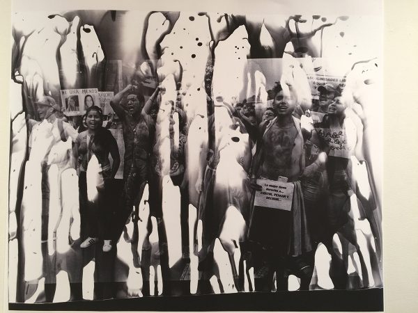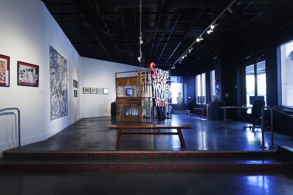Pro Arts Gallery, Oakland: This exhibit and series if performances and events included Lola Remedios Felias hand stitched quilt featured in a series of photos enlarged to depict the harrowing depiction of her capture at the age of 14 by the Japanese Military to become a ”Comfort Woman” to give sexual service to the army. This quilt was given to M. Evelina Galang to show to the world what happened to these young girls and women. Binh Danh’s daguerreotypes series Memory of the My Lai Massacre are work that investigates his Vietnamese heritage and our collective memory of war, both in Viet Nam and Cambodia—work that, in his own words, deals with “mortality, memory, history, landscape, justice, evidence, and spirituality.” The Wire photographs of the American soldiers who were released of their charges, in which their smiling faces contrast the daguerreotypes of death, rape, and destruction on the My Lai Village. When the atrocities surfaced it sent shock waves through the US Government and the already divided American public. Angelica Muro’s Cultura de Femicidio archival pigment prints, 2016 are an investigation into the Culture of Femicide–both the politics of exclusion and the culture of control. Violence against women is prolific in our society. Femicide is a similar concept to rape culture, but one that also applies to the killing of women. Latin America has the highest rate of Femicide in the world. 7 out of 10 countries with the highest female murder rate are in Latin America, and one of the major contributing factors of Femicide is the lack of punishment for offenders, which sends the message that violence against women is normal behavior. The photographs presented here are part of a larger series of appropriated media images of violence against women juxtaposed with images of women that are rising in protest to symbolize the voice and dignity of those who can no longer be heard. Delfina Piretti’s Tabula Rasa installation is blank slate blackboard in the shape a female Buddha, water, roses and sea sponges that invites the viewer to participate, to make their marks or tell their stories knowing it is only temporary, soon to be erased and released into the ether of the world. In the thirty years of working with women healing from victimization and abuse she expresses through this sculpture the wisdom that come from the mind in the body. The whole world is created and birthed through women’s bodies. Dionicio Mendoza takes an ethno-botanist approach to art making, his most recent body of work, “White Wilderness” offers a counter narrative to the view of “wilderness” as a pristine sanctuary, separate from human civilization. Embedded in many of his haunting images are spiders’ webs- symbols of danger and threat- as well elements associated with urban street life like fire-arms and car tires. Descriptions of “wilderness” often overlook the complex historical relationship between landscape and people of color. Mendoza’s “wilderness” are unsafe spaces, were historically, people of color have been murdered, kidnapped, hung and raped. Ascension by Eliza Barrios a site specific installation created for Song for Women Living With War with the text, “We are so used to seeing women as victims of war to be pitied rather than survivors of war to be respected” from writer and journalist Gayle Tzemach Lemmon, known for her work (fiction and non-fiction) about women around the world living and experiencing the challenges of war. The quote, adhered to the risers of the gallery steps, is visible only when you approach to ascend them. This placement is meant to evoke the strength of women transcending the damages of war. Jenifer K Wofford created a suite of portrait prints of some of the longest-living “Lolas”, the Filipina elders who survived the trauma of their comfort-woman experiences in WWII, to honor their experiences and their endurance. Kija Lucas photograph series Pillows brings the home into the gallery with Pillow No. 13. Here, the pillow, an object of personal comfort becomes grotesque with use, a shadow to its original purpose. Stripped of its cover, and transformed into a photograph, a distance is created that makes looking the only possibility. Walking through the exhibit viewers will encounter selected texts on the floor from Jadelynn Stahl’s performance Choreographies of Disclosure, a project that utilizes multidisciplinary performance to complicate existing social narratives surrounding the aftermath of sexual violence, how the traumatized body is perceived and how survivors’ experiences are interpreted.
