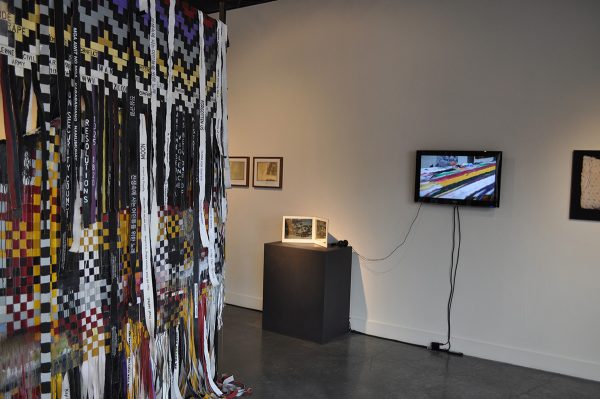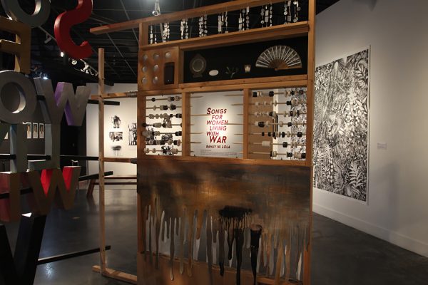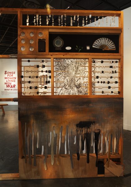 This installation/prototype memorial and anti-war monument is an arrangement of three walls forming an open house structure with elements of the traditional architecture and materials of the Philippines. This “living memorial” that remembers women and the violence they suffer was originally inspired by writer M. Evelina Galang’s work with WWII Comfort Women, the Lolas. There are few monuments to women and war. Rooted in the history of the WWII Comfort Women but reaching across history in local and global contexts the concept of “Songs” for women came to light. Women have been passing down their stories in songs through the ages. Sexual violence against women knows no time or place or nationality- it is a phenomenon endemic to our culture of war, patriarchy, and violence. This “living memorial” seeks to create a platform of understanding that these crimes against humanity do not begin and end on the battlefield. The textile wall of the Bahay ni Lola /House of the Grandmothers is woven as a banig or mat, draped with stories and texts collected from multiples sources. The wood wall with the pierced abacus window holds an image of intimate belongings photographed by Kija Lucas and a sound element by composer Anne Perez who weaves multiple voices together to create a living sonic space. The cadence and emotion of the spoken words drive the pace, rhythm and emphasis in this composition mixing Lolas’ voices from the interviews with author M. Evelina Galang and the ongoing collection of “songs”. The voices include Claudia Bernardi, M.Evelina Galang, Lila Shahani, students at the Visual and Public Art Department (VPA), CSU,Monterey Bay and voices of South Korean, Indonesian and Chinese Comfort Women from interviews found on the internet. “Lips of Lapis Lazuli” the collective sounding led by musician/composer Theresa Wong, performed at CSUMB in Spring 2016 flows throughout the composition altered and processed to echo visual elements of the woven wall, the carved tears, the clicking of the abacus, wind and rain sounds in the capiz and the marching sounds of war. The quote by bell hooks is read by Johanna Poethig. The prototype monument was designed and built under the direction of Johanna Poethig with the Visual and Public Art Department (VPA), CSU,Monterey Bay and continues to be developed for new exhibitions and public sites.