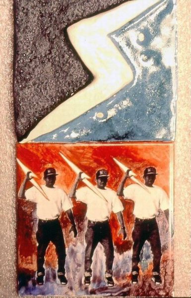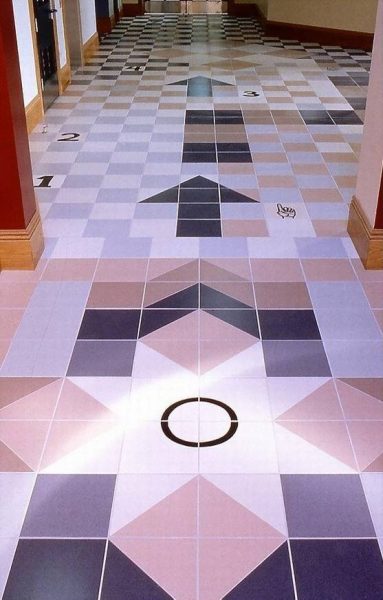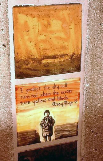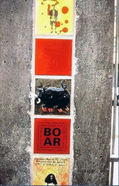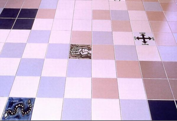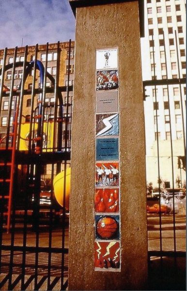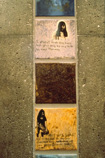 This project consisted of ceramic installations and floor design (12 2′ x 10′) Pillars, drinking fountain, 2 bathrooms and 2,000 square ft. floor). On one side of the pillars the work was titled “Epic” and the other side the series of tiles was titled “Predictions”. Photos of the youth from the Vietnamese Youth Development Center, were fired onto the tile with hand painted backgrounds or text relating to their story “Epic” or their personal predictions. The floor is designed as a game board and tiles with drawings, text and photos can be found in the bathrooms and by the water fountain.Commissioned by the San Francisco Art Commission Public Art Program.