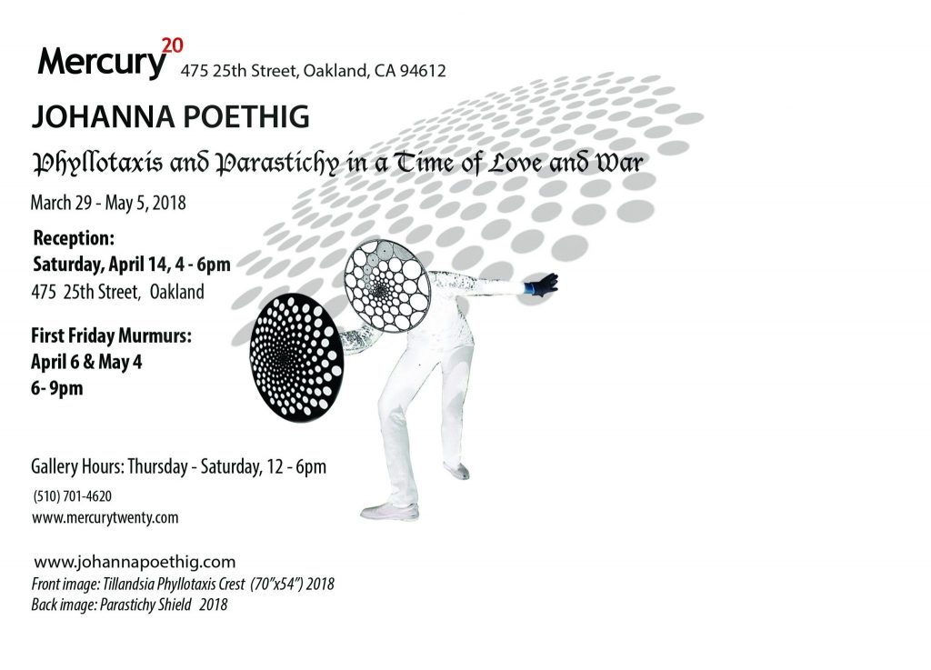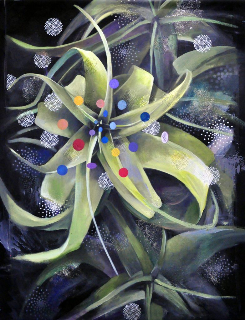 We live in a time where science is fake and social algorithms entrap us. For the past century, botanists have studied the nature of phyllotaxis and the algorithmic beauty of plant growth patterns. The science that uncovers these systems that create life is the inspiration for this series of paintings and prints. Phyllotaxis is the spatial and temporal arrangement of leaves or petals around a stem or plant axis. Parastichy is the invisible, hypothetical spiral line connecting a series of leaves on a stem that create an effect on the human eye. The surreal gardens that I paint overlay organically drawn and mathematically generated computer models of plant algorithms mixing realism and abstraction. The story of love and war imagines a world populated by futurist plant people tangling with misshapen primordia in the toxic sludge of human de-evolution using phyllotaxis and parastichy masks as subversive algorithmic shields.